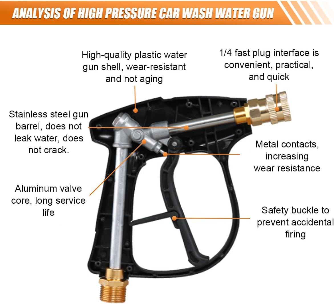 【High-Quality Materials】:This car wash gun is made of high-quality aluminum alloy, ensuring durability and a long service life. Its handle features an ergonomic design for a comfortable grip and is equipped with a safety lock to prevent accidental spraying.