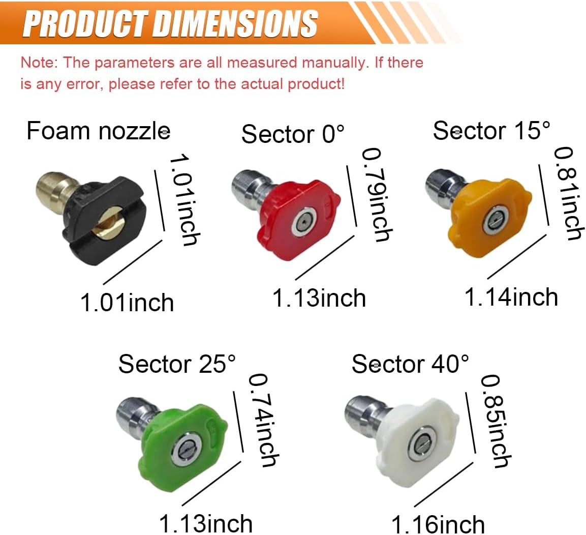 【Package Contents】:You will receive 1 car wash gun, 1 black brass foam nozzle, 1 red stainless steel 0-degree nozzle, 1 yellow stainless steel 15-degree nozzle, 1 green stainless steel 25-degree nozzle, and 1 white stainless steel 40-degree nozzle. The complete accessory set meets your cleaning needs.