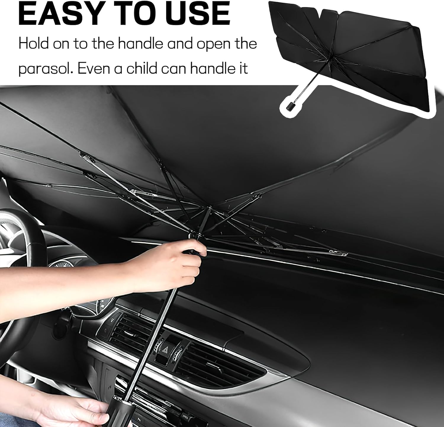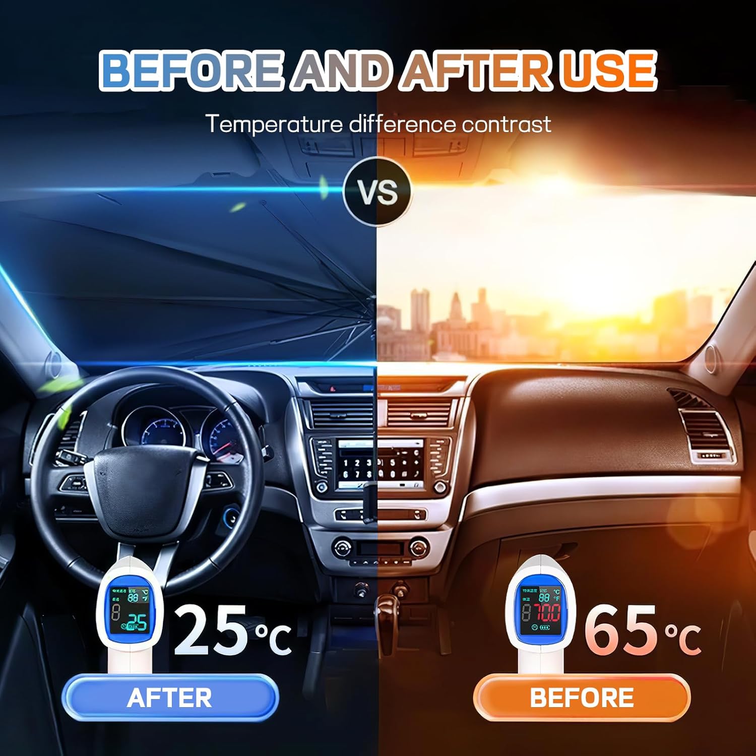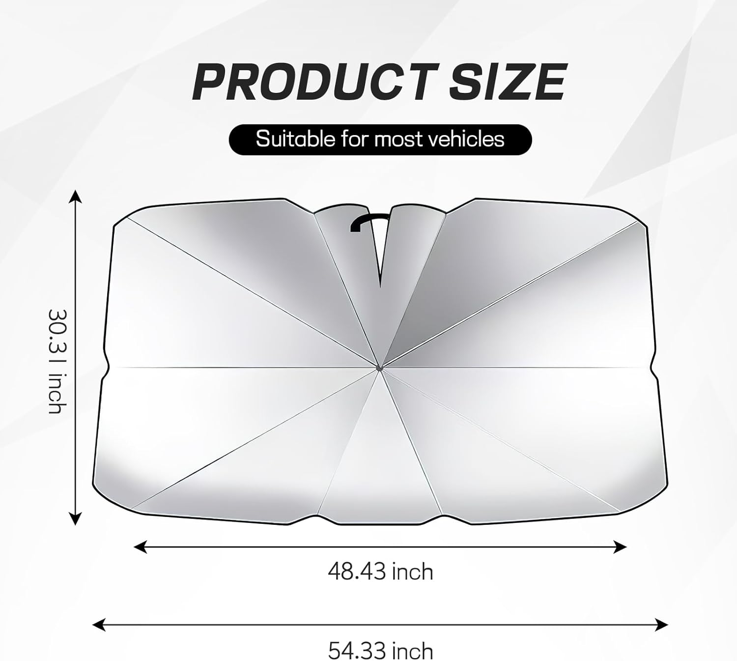 【Sizes & Applications】: Our windshield sunshade umbrella measures 54.33×30.31 inches (138×77cm) and fits most vehicles, including cars, SUVs, minivans, etc., but to make sure the proper fit, please check your windshield size before ordering. You are also free to choose between the thickened style and the style with opening.