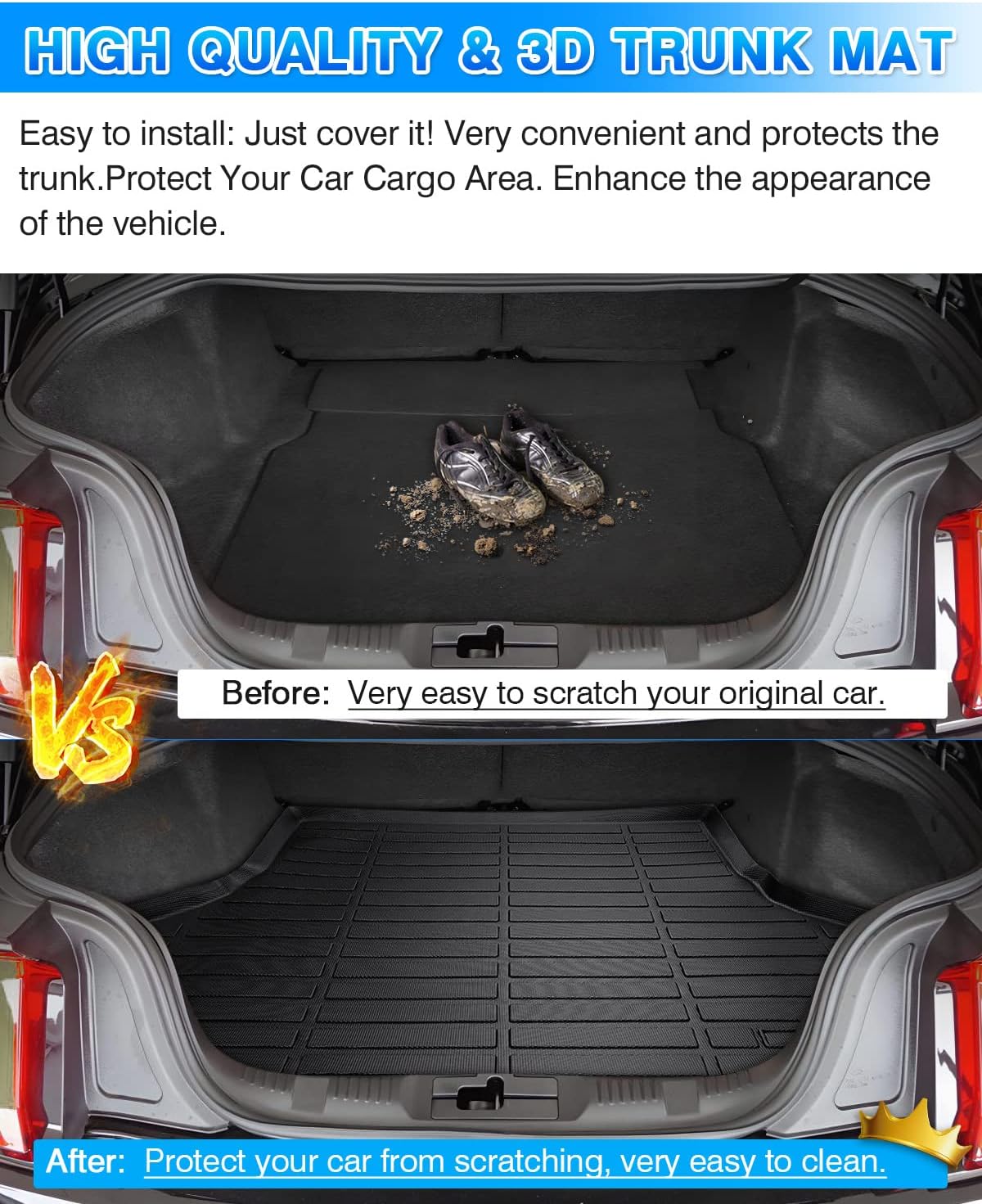 【Vehicle Specific】Our Trunk mat designed for 2015-2025 Ford Mustang 6th Generation (Without Subwoofer in Cargo Area)(Not for Mach-E). 3D precisely measuring,100% protecting your trunk carpet space. Please check the models of your car carefully before purchase.