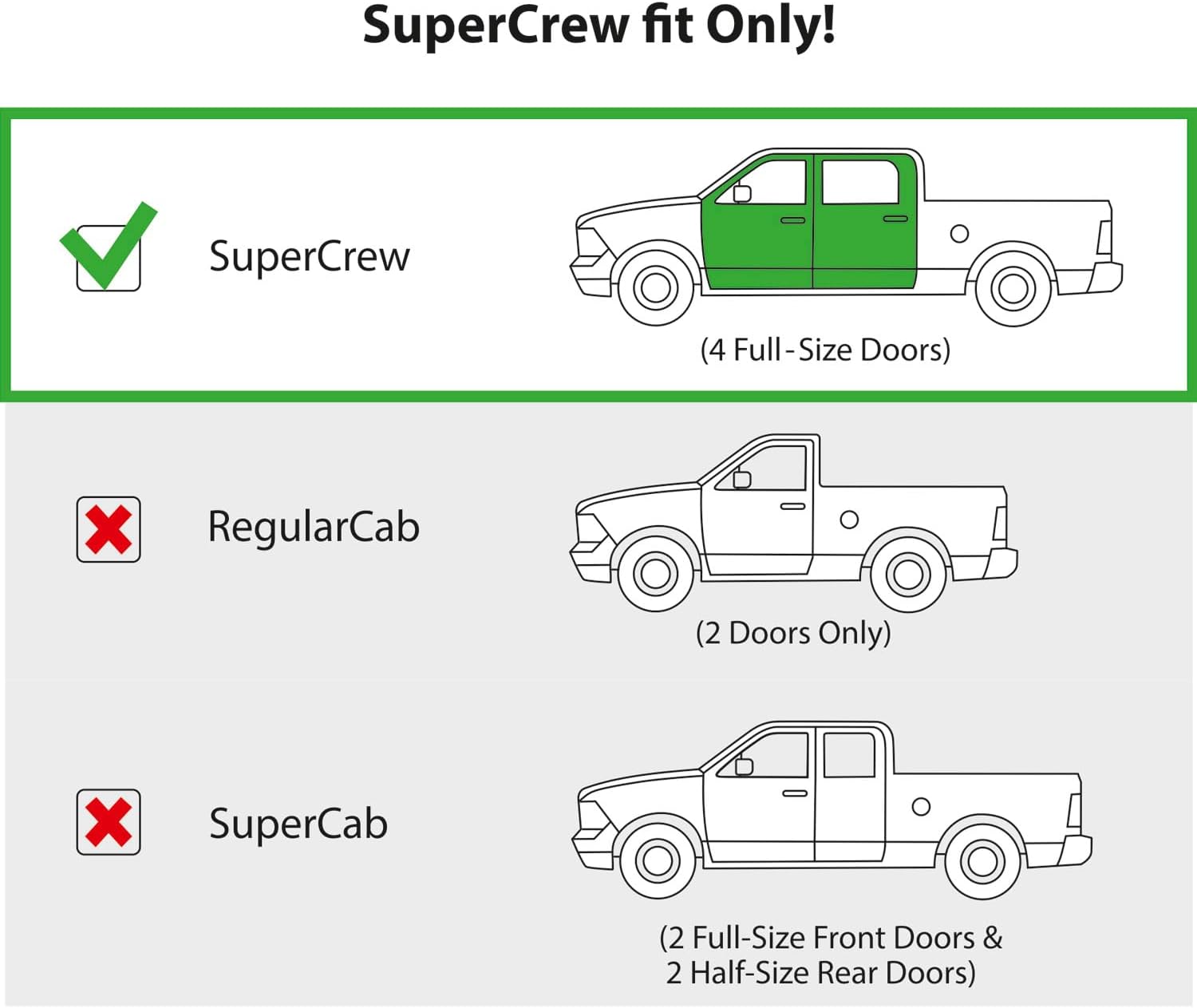 Attention! Accessories FIT only for Ford F150 2015 2016 2017 2018 2019 2020 SuperCrew, F150 Raptor 2017-2020 SuperCrew; Ford F250 Super Duty 2017-2022 Crew Cab, Ford F350 Super Duty 2017-2022 Crew Cab, Ford F450 Super Duty 2017-2022 Crew Cab, Ford F550 Super Duty 2017-2022 Crew Cab (do not fit for Ford F-150 2021-2025)
