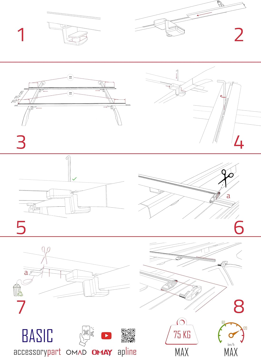 BASIC Model Roof Rack This product is suitable for models with a gap between the roof of the vehicle and the roof rail. This product is easily mounted on the roof rails in your vehicle. However, it cannot be used in vehicles without roof rails. The surface coating of the Basic Model Roof Rack is anodised for durability and aesthetics. Black and grey colour options are available. Please pay attention to the colour specified in the listing title. The assembly of the product is very simple and the instructions are presented to you in the product package. A single person can easily perform the assembly process without professional help. Package Contents 2 pieces of aluminium bar (fully compatible with the vehicle in the title of the listing) 4 pieces of aluminium bar connection kit. 4 Pieces Profile Cover, 4 Pieces Bottom Bracket, 4 Pieces Elastomer Bottom Bracket Protector, 4 Pieces Bolt (+ or ⬡) 4 Pieces Nut 1 Piece Allen Key (if the bolt is ⬡ head) The maximum load carrying limit with this product in a moving vehicle is 75 kg. (Regardless of 2 or 3 aluminium bars, the legal limit is 75 kg). In addition, the Basic Model Roof Rack Profile has a channel opening on the back side of the profile and an extension allowance on the lower bracket, which provides flexibility to the users. This feature allows the length of the profile to be shortened or lengthened as desired, providing more convenience and harmony in the assembly process. Thanks to the bottom bracket, you can adjust the length of the profile to the desired dimensions and achieve exactly the harmony you are looking for.