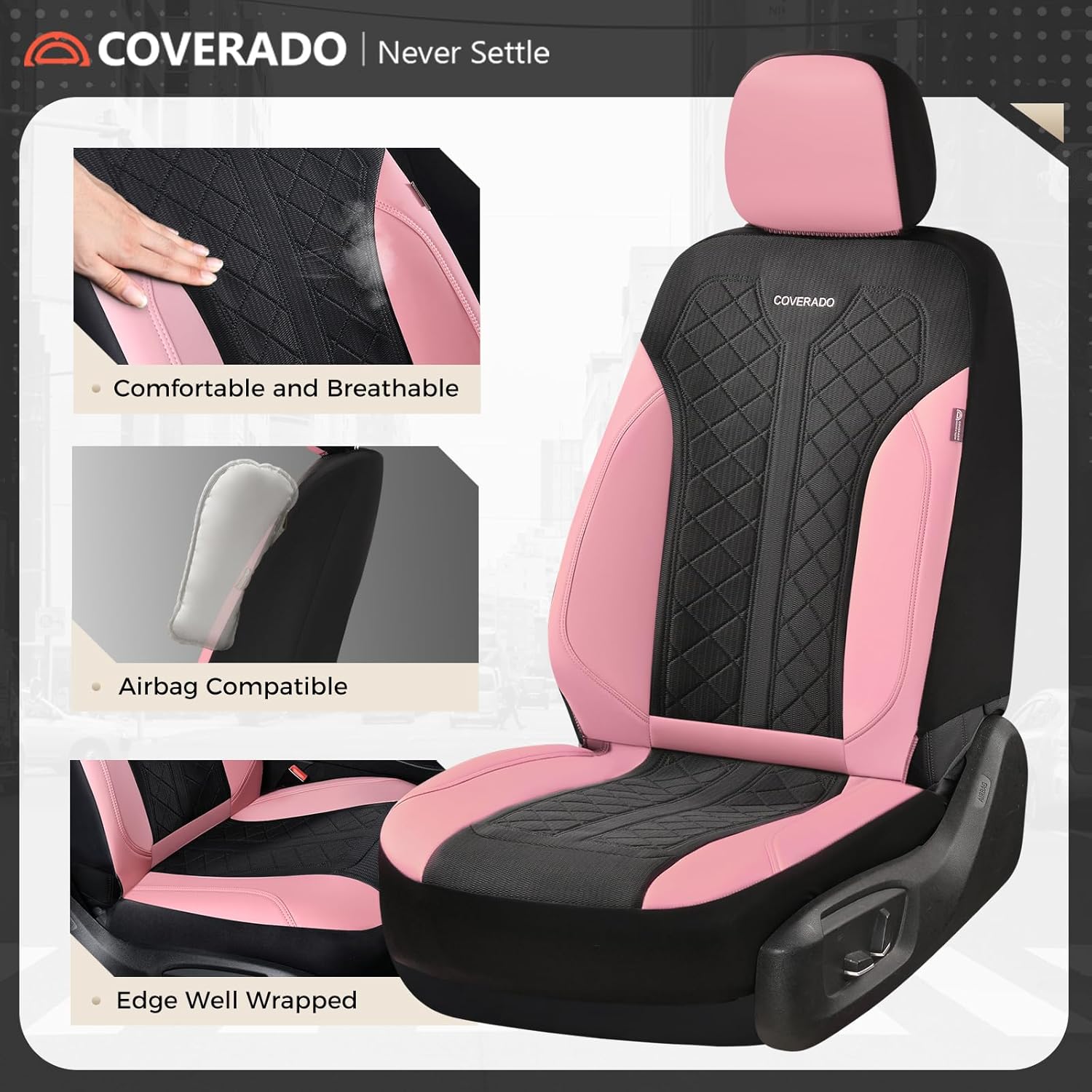 Coverado Automotive Seat Covers Full Set, Luxury Car Seat Covers, Leather Seat Covers, Mesh Design, Pink Driver Seat Protectors, Universal Fit for SUVs, Trucks, Sedans