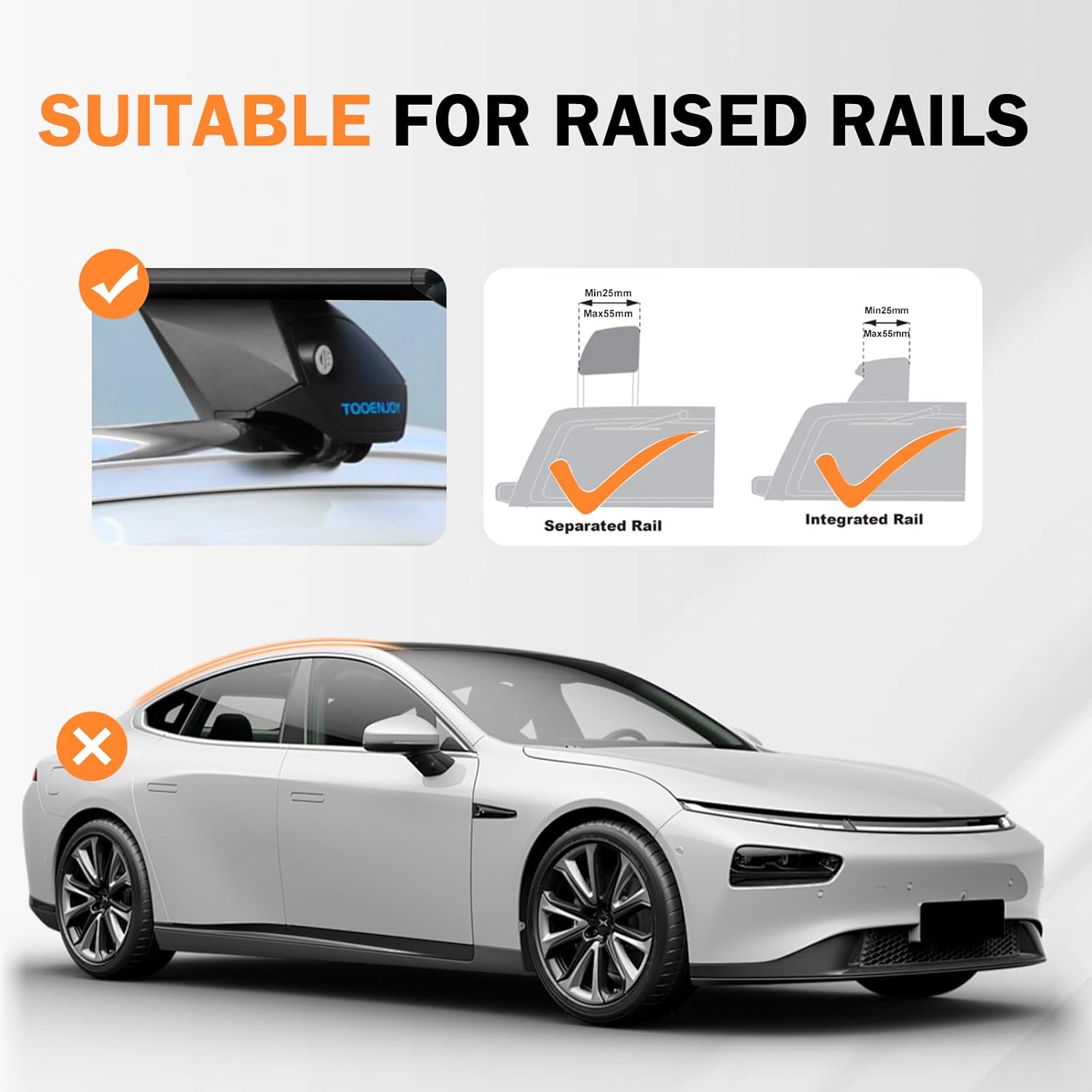 Raised Rail Fit: Our roof rack cross bars are adjustable from 35.8 inches to 50 inches, flexibly compatible with Cars, Vehicles and SUVs with raised side rails with a gap between 35.8 and 50 inches. Featured 4pcs premium locking set for anti-theft