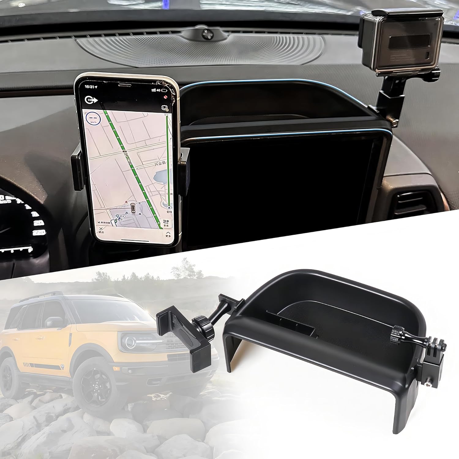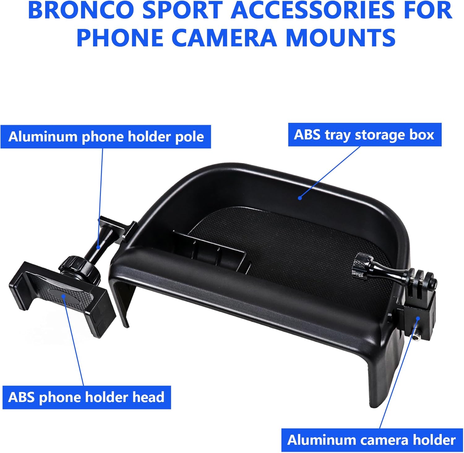 MULTI-FUNCTIONAL: Bronco Sport accessory phone camera mounts are made from ABS phone mounts, aluminium phone mount heads and mount rods, aluminium camera mounts and mount rods and ABS trays. For Bronco sport cell phone holder for 4in-7in the phone,Camera mount for GoPro Insta360 DJI Osmo Action cameras, Centre display storage box for small items such as mobile phones, maps, sunglasses, chewing gum, wallets, notes, tissues, etc