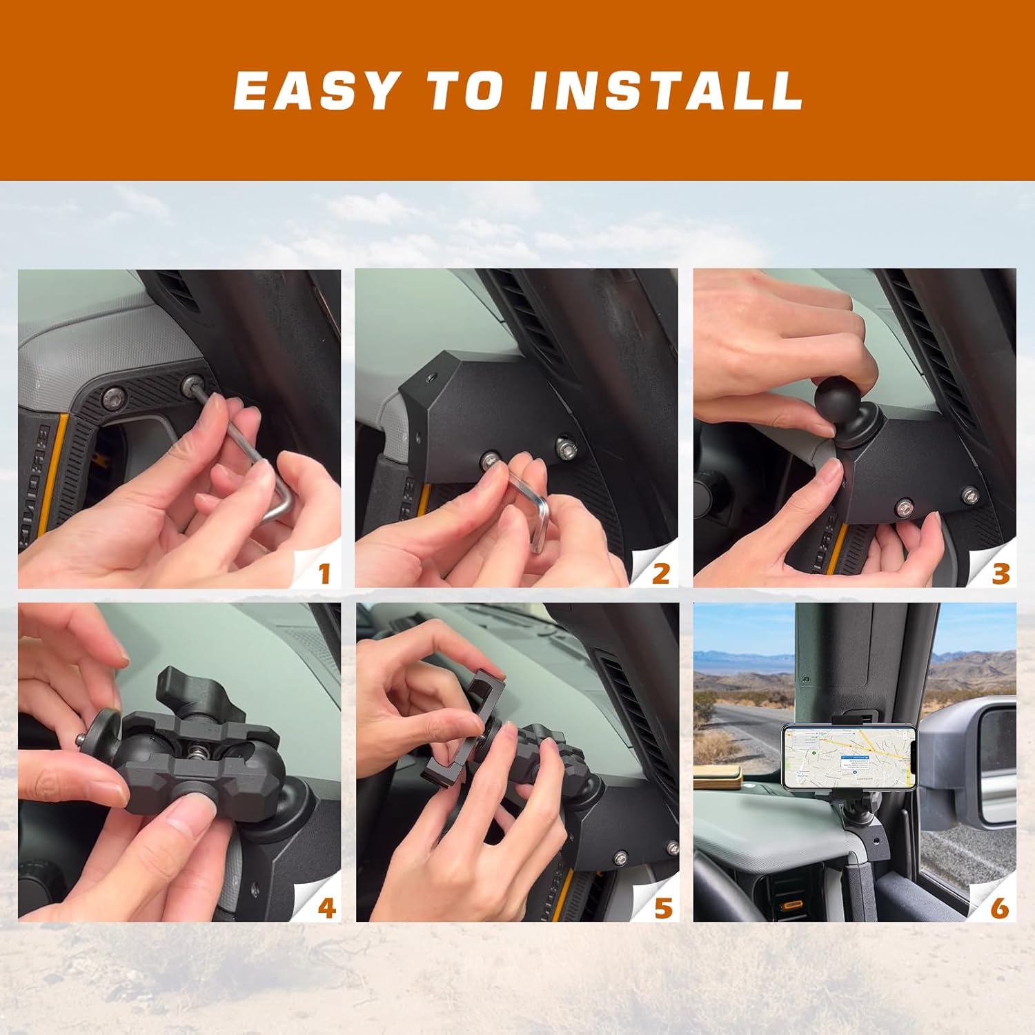 【Unique fixed way】AL4X4 phone holder for Bronco is installed on the passenger side of the dashboard, which is more stable and does not shake. Use the original hole position for installation, will not block the view, and has a better off-road experience. Fits perfectly with the original Bronco, looks like it was factory set.