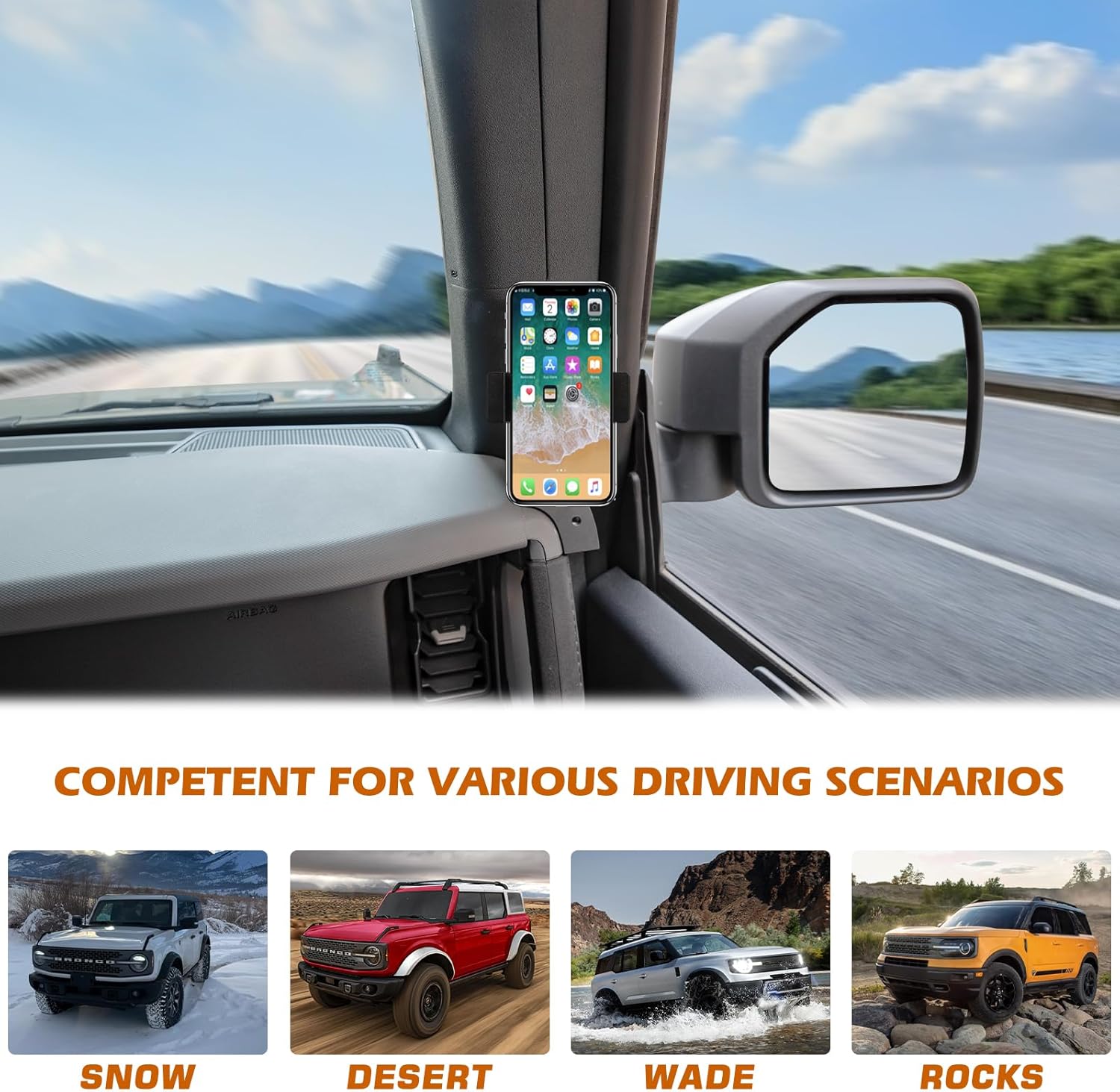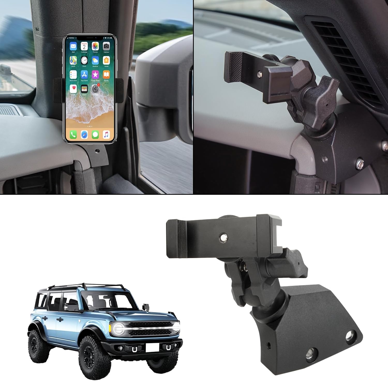 【Application】Dashboard Cell Phone Mount compatible with 2021 2022 2023 Ford Bronco 2 Door & 4 Door. It is a good companion for you on the driving road. (please note not applicable to Bronco Sport)