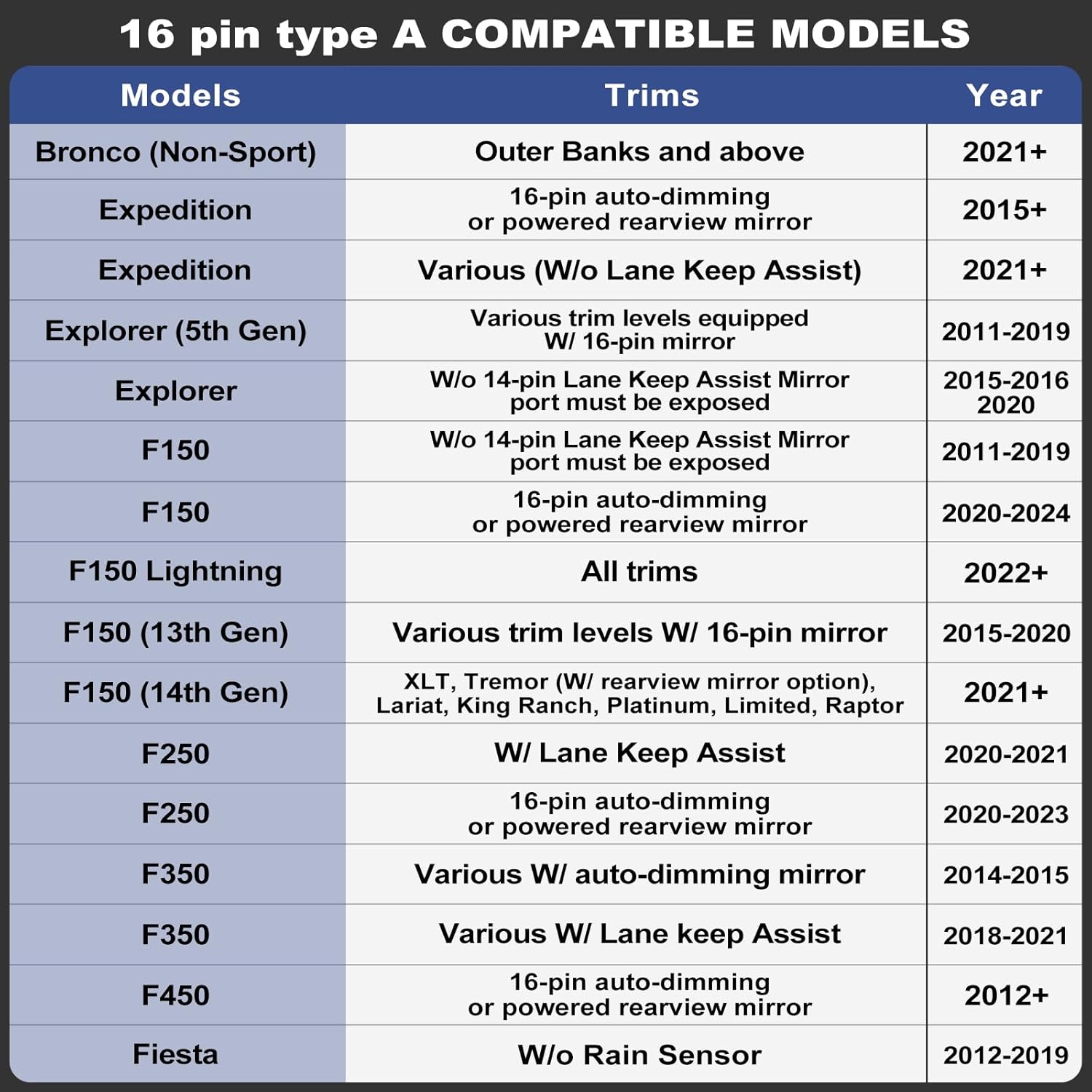 Compatibility Check Required: Confirm that your vehicle has a 16-pin connector on the rearview mirror. This adapter is suitable for Ford models including F150 (2011-2023), Bronco (2021+), Explorer (2011-2019), Mustang (2013-2021), and more. Please refer to the compatibility chart before purchasing.