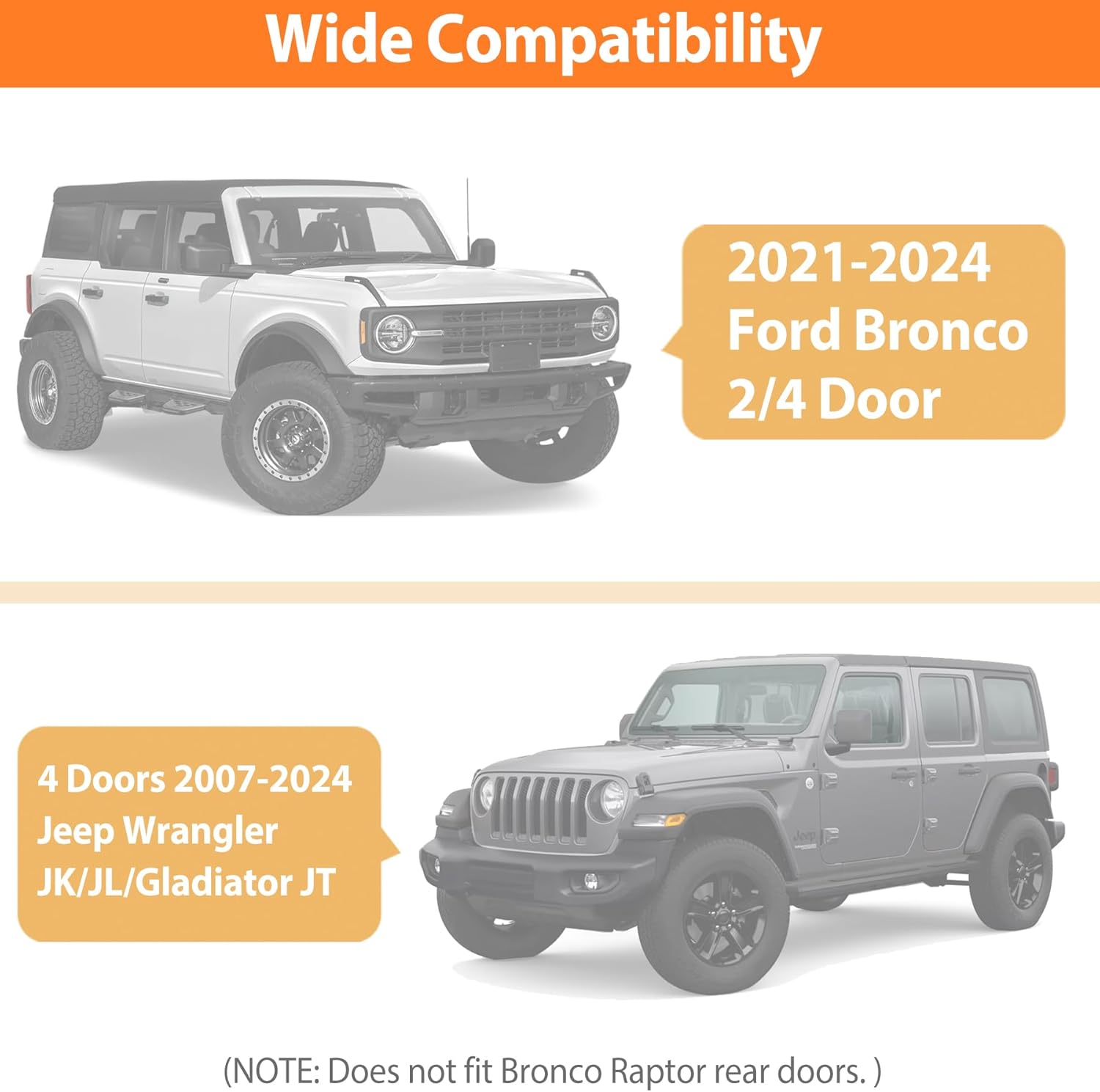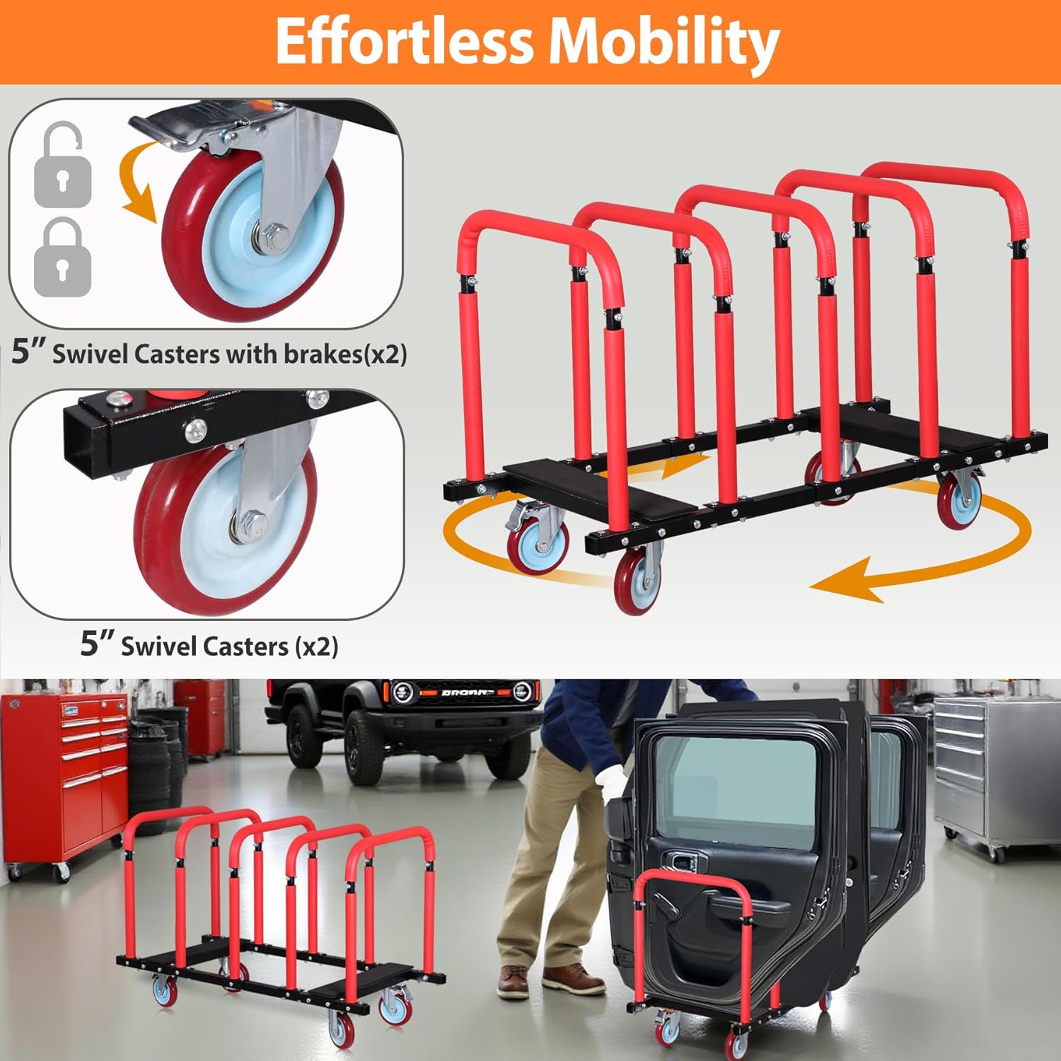 Wide Compatibility: Chintooler door rack storage cart is compatible with JEEP WRANGLER JK/JL/JT 2007-2024 & FORD BRONCO 2/4 DOOR 2021-2024. (NOTE: Does not fit Bronco Raptor rear doors. ) Heavy-duty steel frame secures 4 doors vertically, freeing 80% floor space for your garage/truck bed.