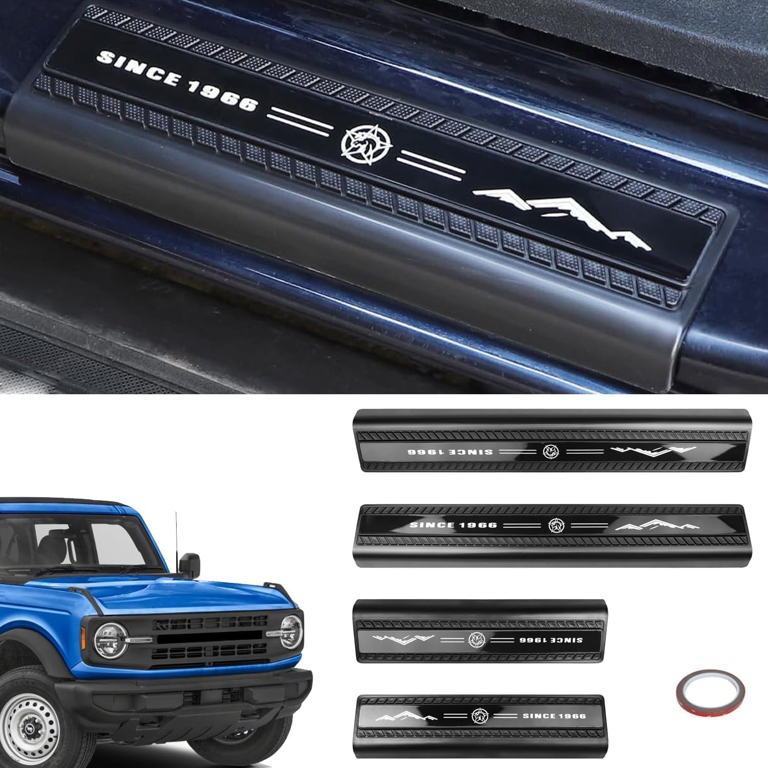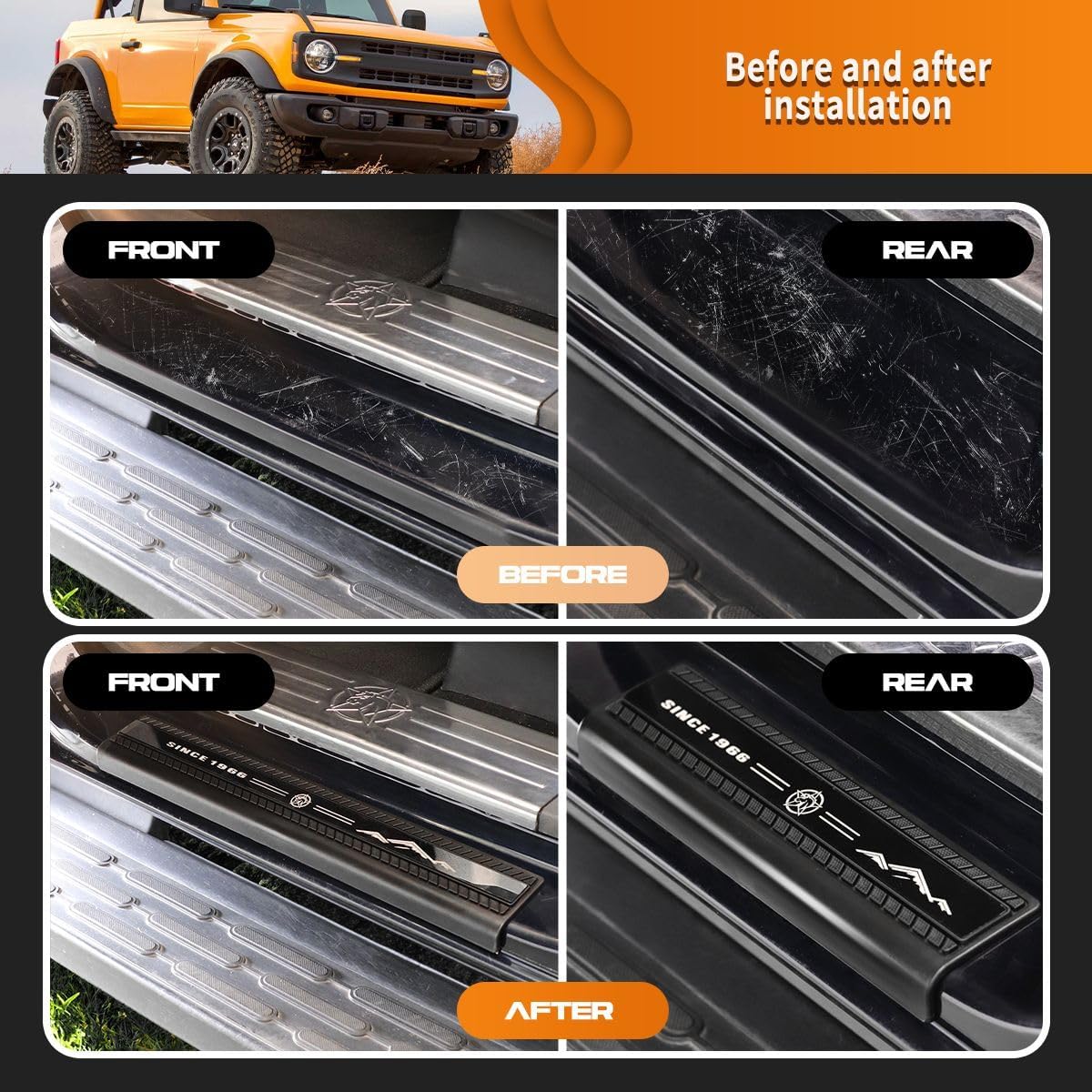 You may be annoyed with the scratches and deep grooves forming from people getting in and out stepping on your Bronco, and it gets slippy when wet. Now our Bronco door sill guards can solve all your problems. It not only gives your door sill comprehensive protection but also helps cover up existing scratches. Meanwhile, it boosts the appearance of your door sill, a must have for your Bronco.