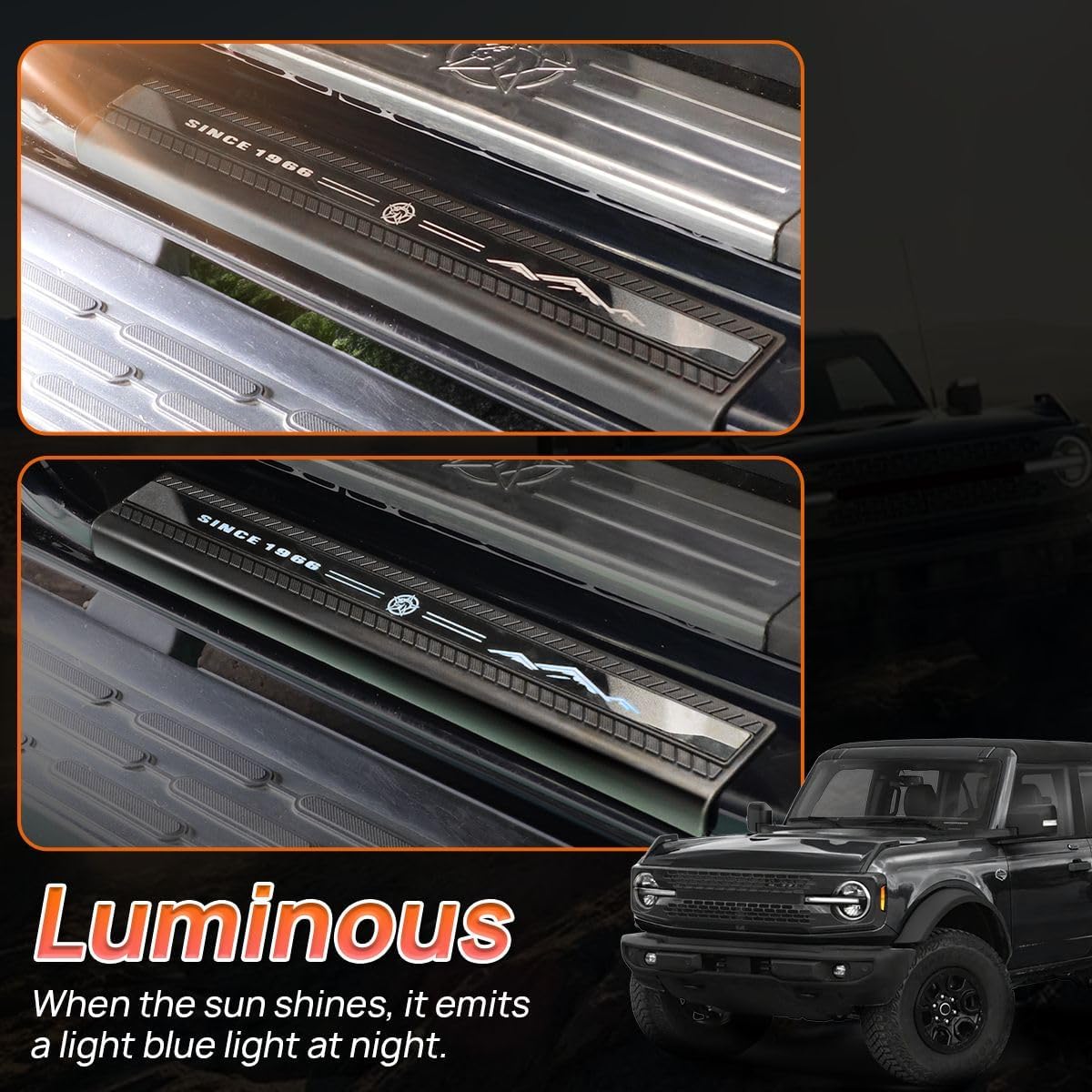The door sill protector cover is fit for Ford Bronco offroad 4 Door 2021 2022 2023 2024 2025,does not fit for Ford Bronco Sport and 2 Door version.Say goodbye to ordinary styles,our products come with good quality Acrylic on the surface,unique patterns,and night reflective features,perfectly decorating the vehicle and making your car stand out.