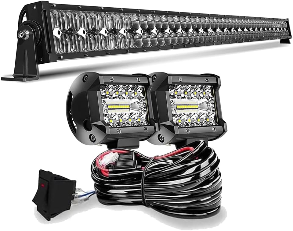 Package Include: 1* 52Inch 300W 5D Led Light Bar 2* 4Inch 60W Triple Row LED Cube Pods 1* Rocker Switch Wiring Harness