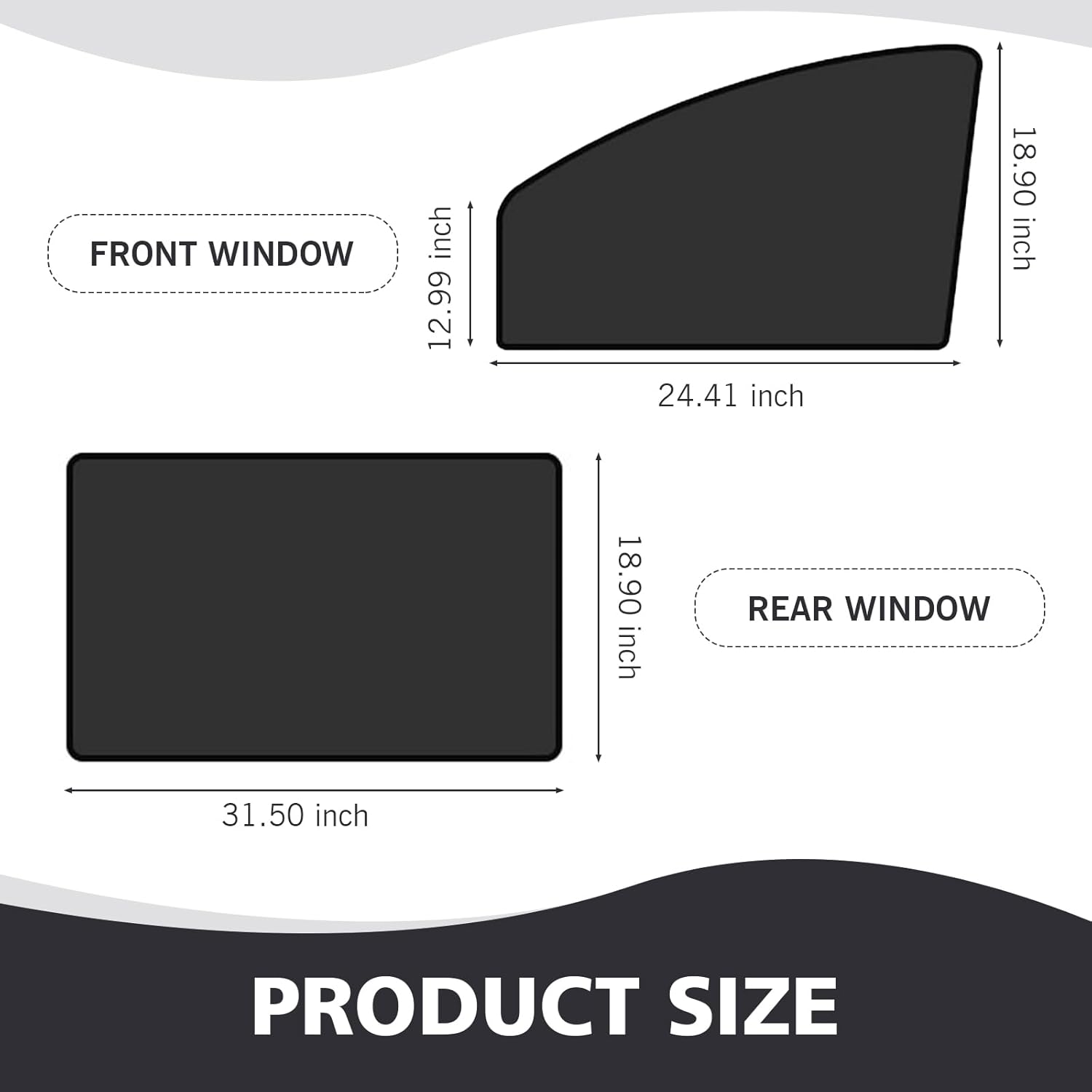 2.The size of this car front window sunshade is 24.40 inches x 18.89 inches x 12.99 inches, and the size of the rear window heat shield is 31.49 inches x 18.89 inches.