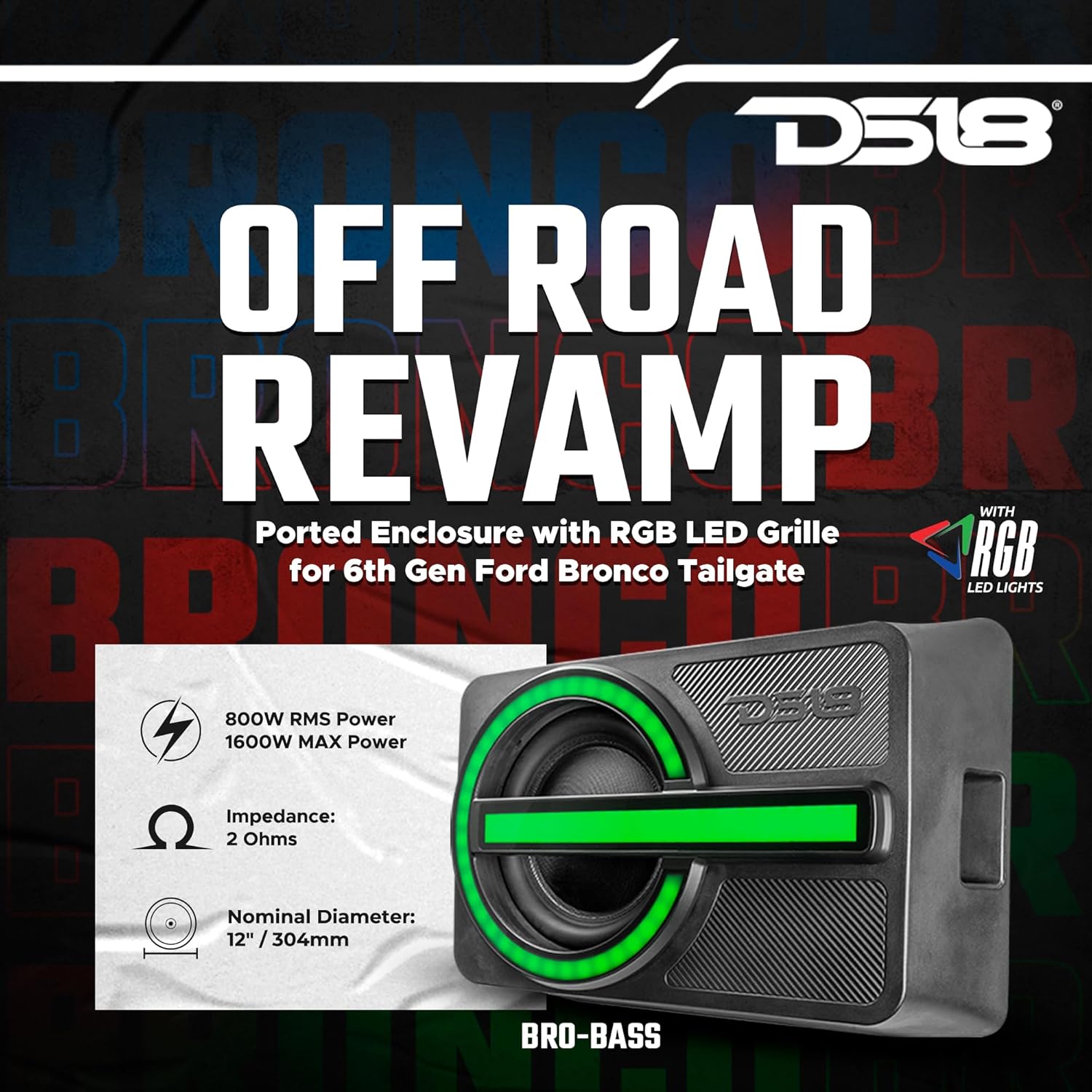 DS18 Ford Bronco Tailgate Enclosure with 12″ Subwoofer 800W RMS 1600W Max Power 2 Ohm – Water Resistant – RGB LED Lights – Ported Vented Box with Bass, Easy to Install – Designed for Broncos 2021+