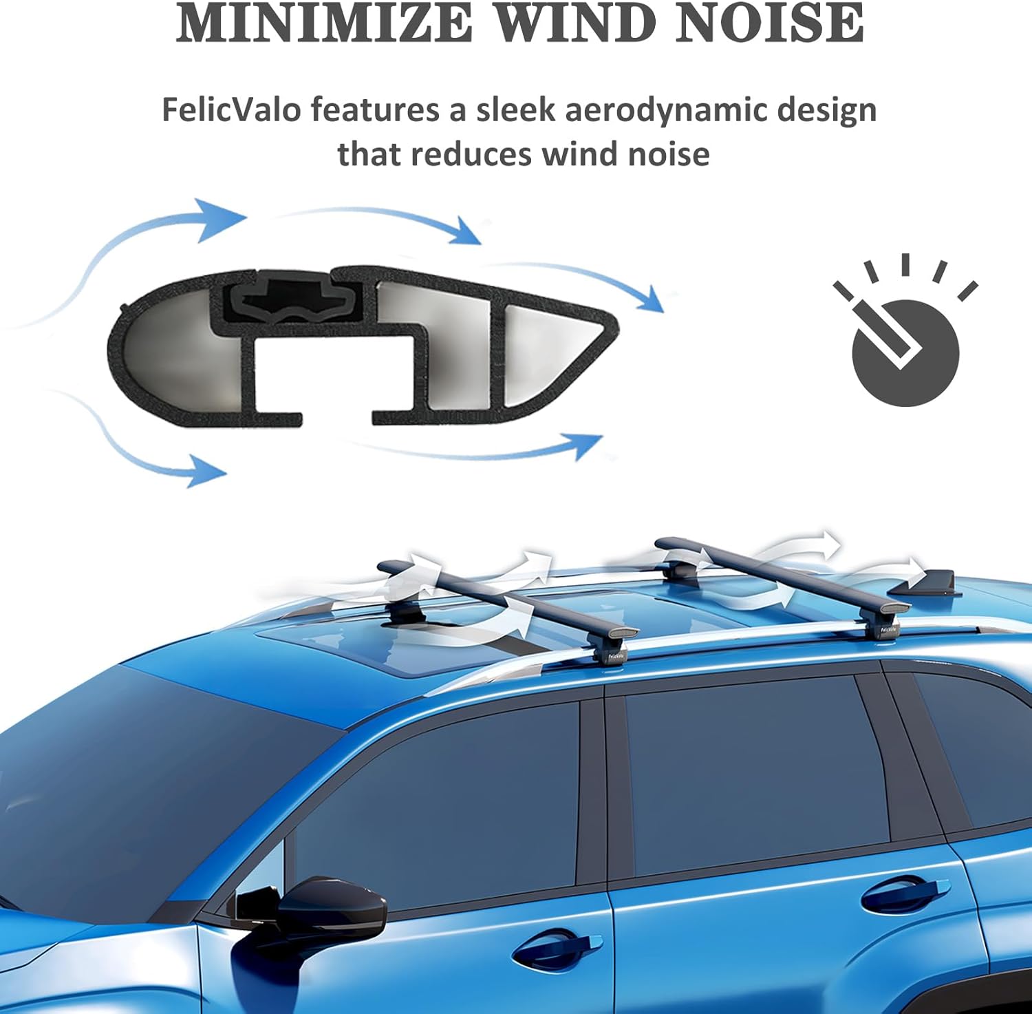 ✔️【Minimize Wind Noise】: FelicValo roof rack crossbars offer an aerodynamic profile that significantly reduce wind noise. Let you focus on driving pleasure and enjoy the journey.