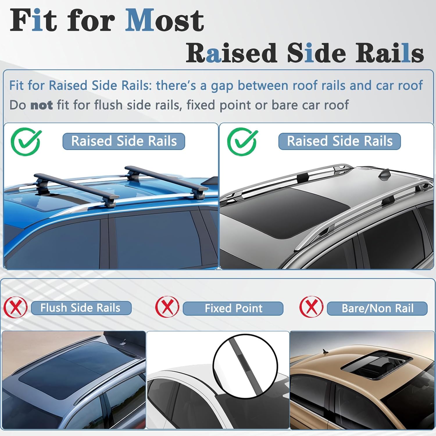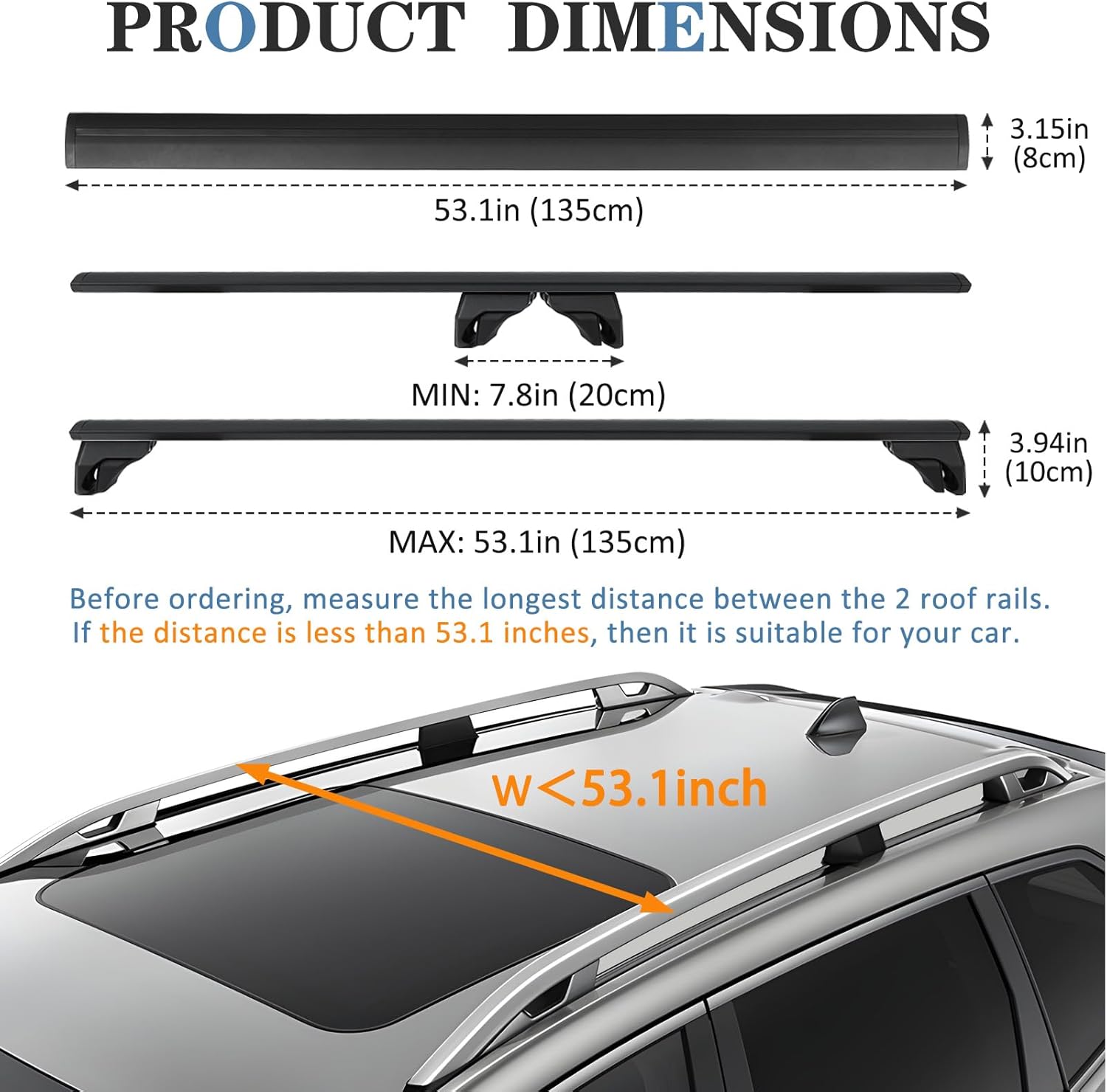 ✔️【Compatible Vehicle】: FelicValo roof rack cross bars are Universal, compatible with Raised Side Rails with Gap. Measure the longest distance between your car 2 roof rails. If the distance is less than 53 inches, then it is suitable for your car. If you’re unsure about compatibility, please don’t hesitate to contact us for assistance.