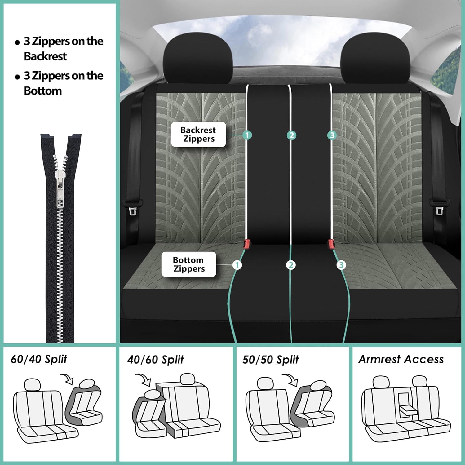 🚘[CUSTOMIZABLE REAR COVER] This cover is compatible with any split bench and becomes 2 individual covers with the extra mesh piece. This cover features zippers providing full access to the middle armrest. Elongate cover by adding an extra piece.