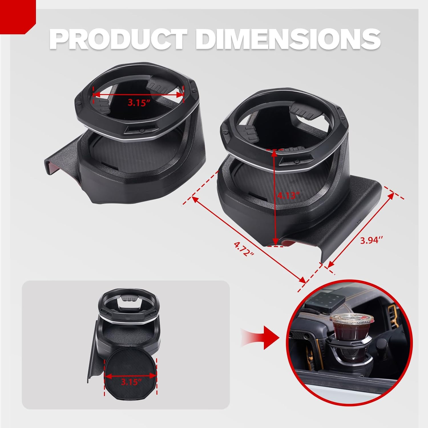 NON-SLIP DESIGN: Sturdy construction with non-slip bottom surface keeps drinks securely in place while driving. Each holder features a rubber-lined interior and non-slip base to firmly grip bottles, tumblers, or cans up to 3.15” in diameter.