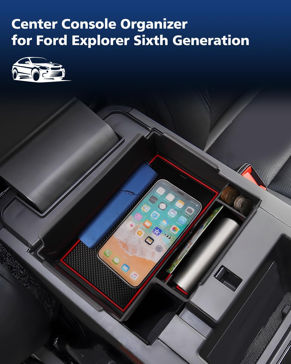 Expand Storage Capacity: The middle console organizer for Ford Explorer 2020-2025 creates different compartments to fit individual needs, enables your items to be well organized, and lets you find your accessories at a glance. There is enough space to place some small items in the center console organizer, such as the phone, wallet, keys, coins, cigarette, etc.