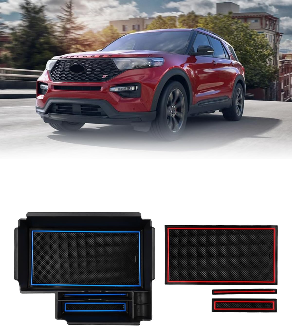 FIILINES Center Console Organizer for Ford Explorer 2020-2025, Armrest Storage Box ABS Console Insert Tray Container Accessories with Red Blue Mats