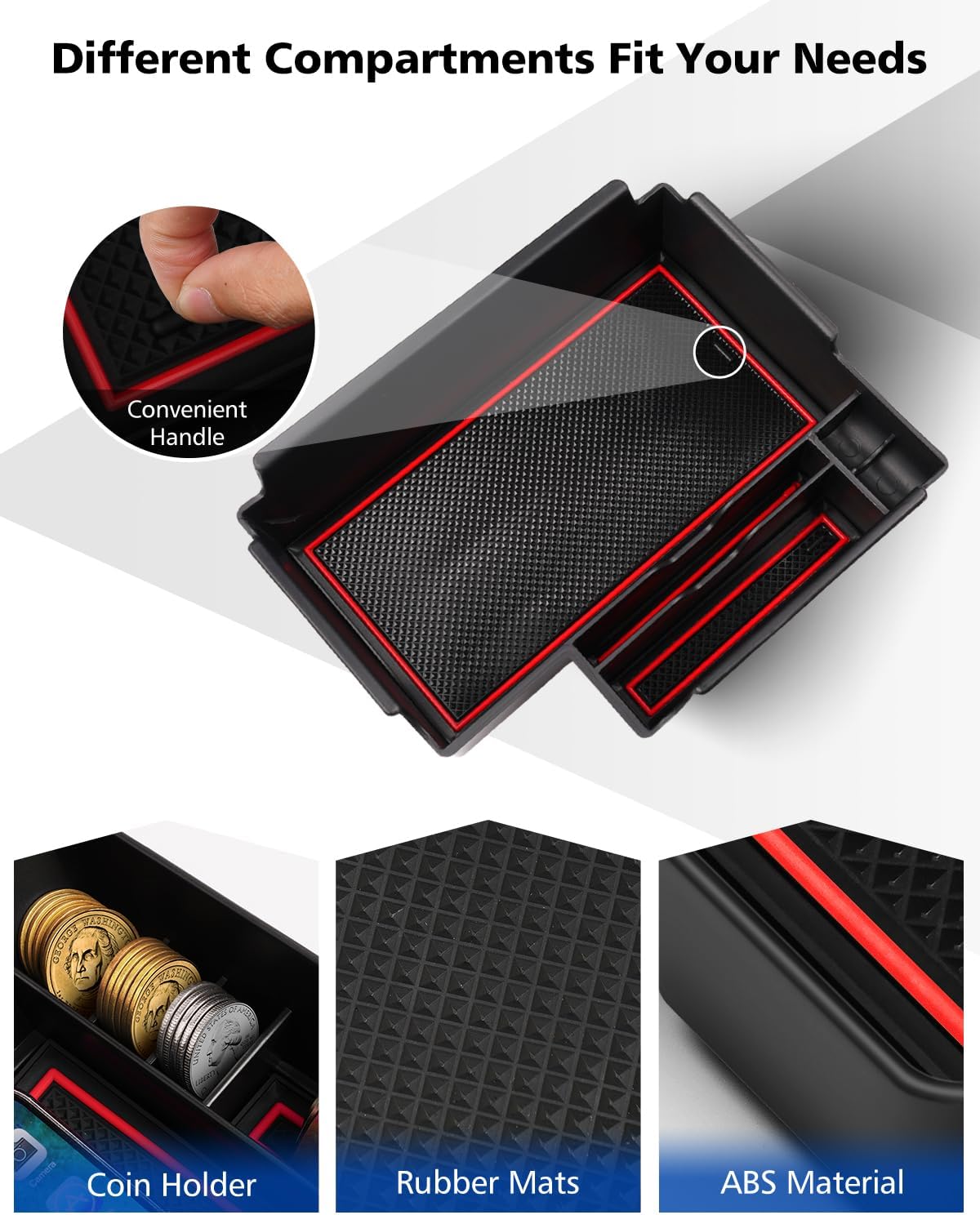 2 Color Anti-Slip Mats: There are some non-slip rubber mats in the armrest organizer to prevent items from moving and reduce noise. The center console storage box has two sets of colored mats, red and blue, which can be replaced and cleaned.