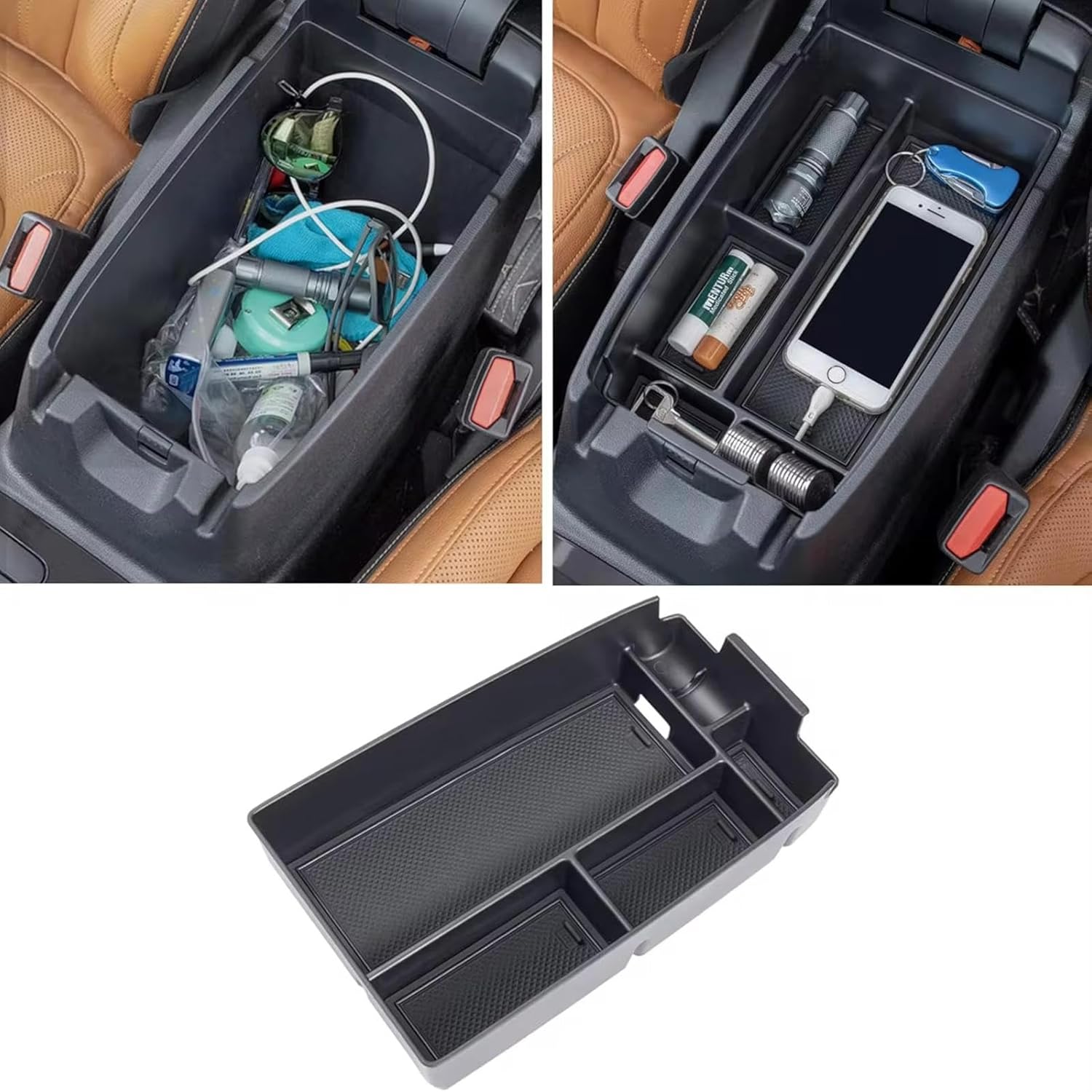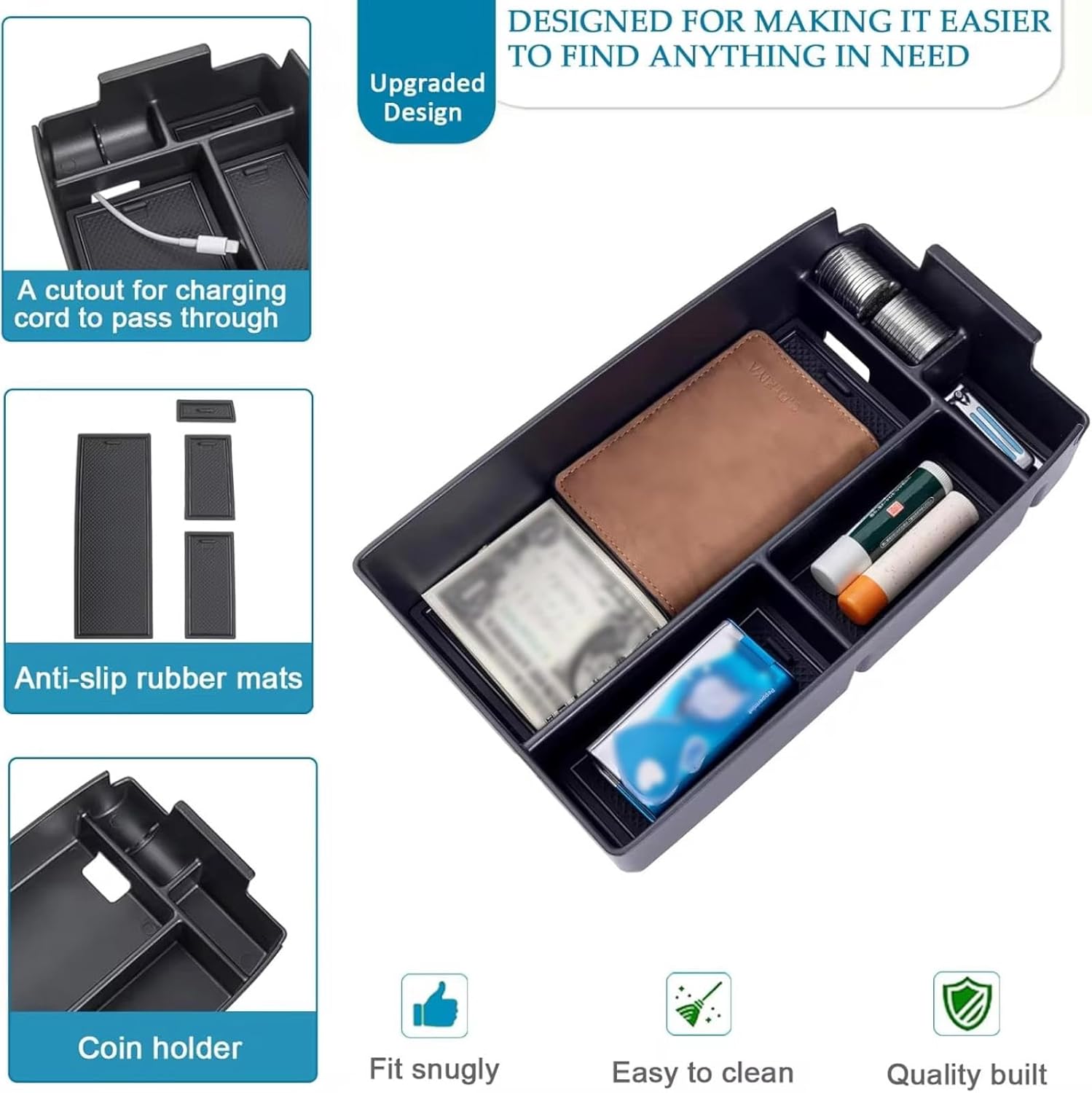 ✅【Anti-skid pad design】The center console tray comes with an anti-skid rubber pad, which is removable for easy cleaning. The thickened anti-skid pad prevents the items in the tray from making noises due to collisions while the car is driving.