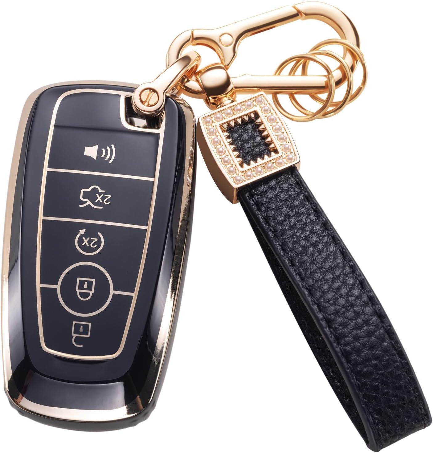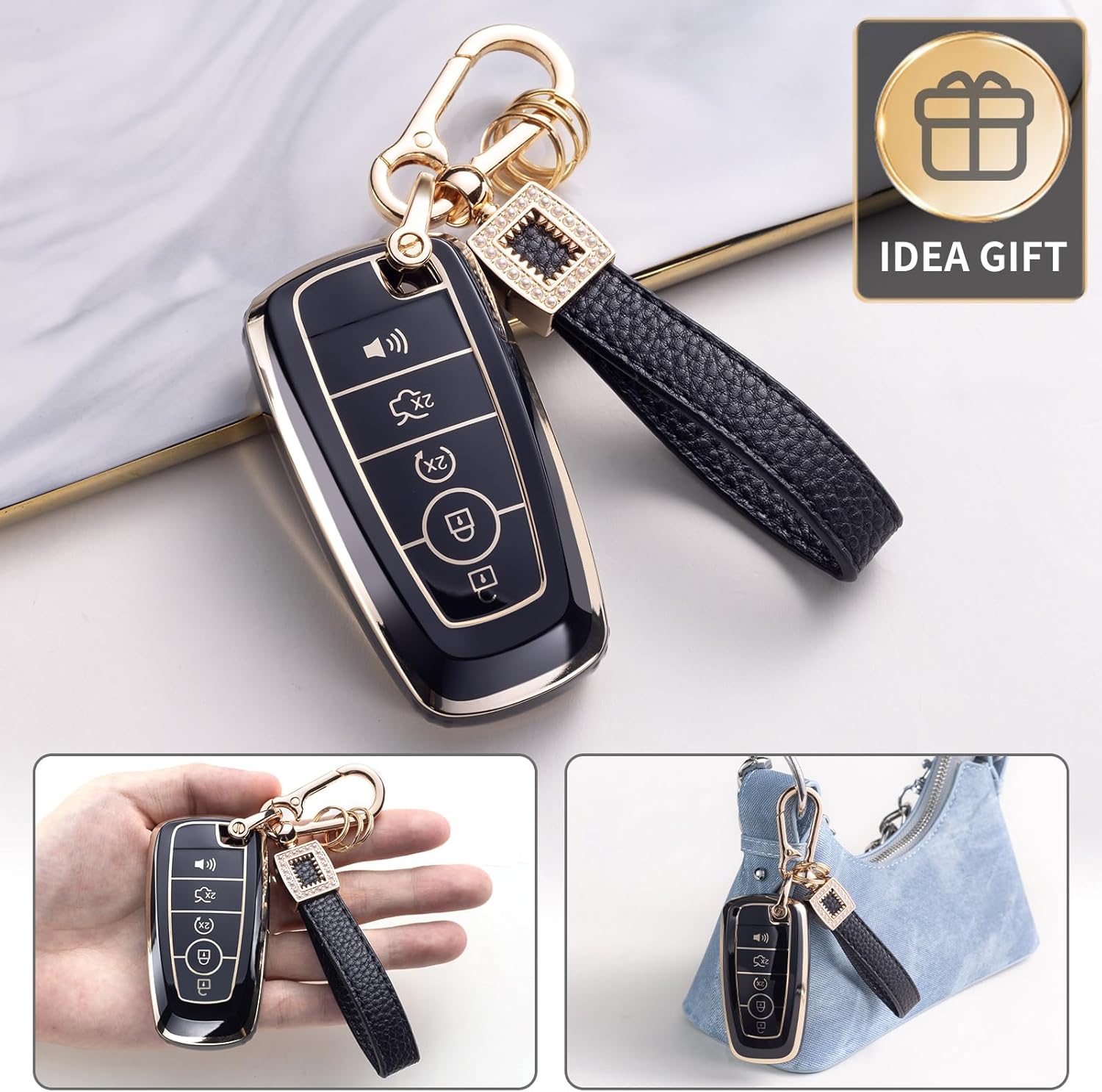 for Ford Key Fob Cover with Leather Lanyard, Car Key Fob Case Compatible with Ford Explorer Fusion Escape Edge Expedition Maverick Mustang Bronco F150 Smart Key Protector Holder