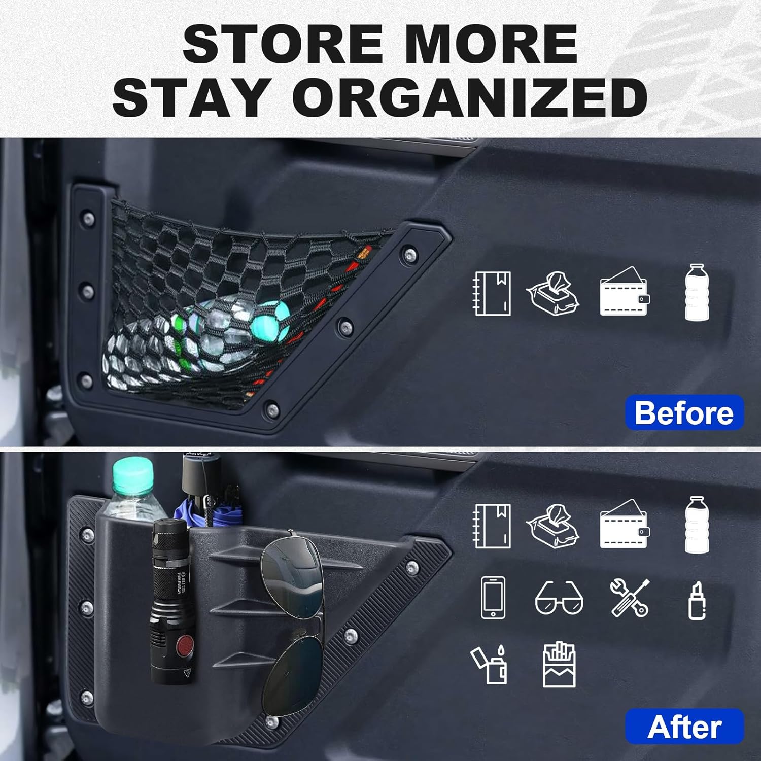 【STORE MORE, STAY ORGANIZED】4PCS Ford Bronco Front & Rear door pockets maximizes storage by fitting over the original net pocket; Conveniently store drinks, phone, keys, wallet, tissues, hand cream, sunglasses, and more!