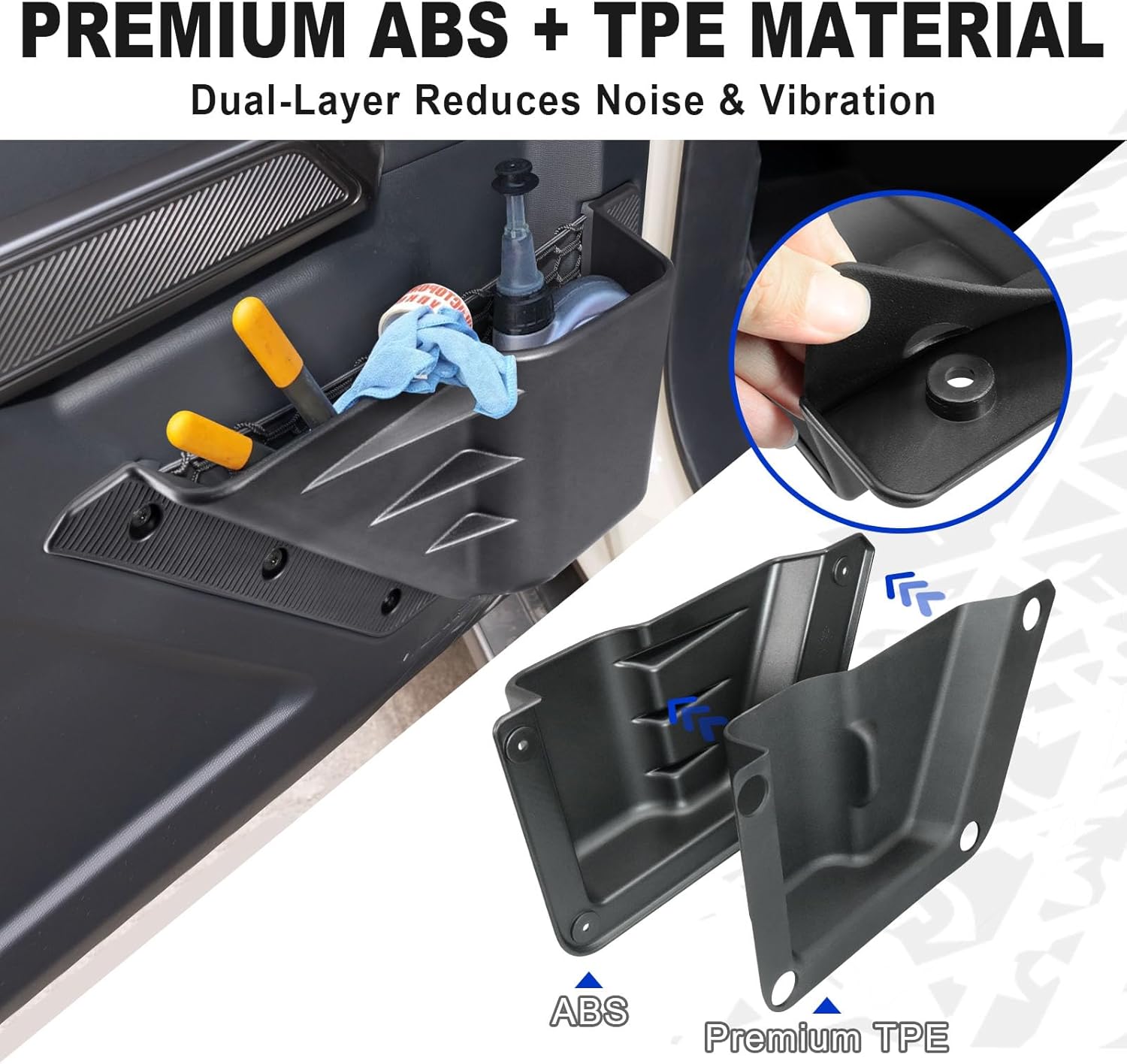 【DUAL PROTECTION】Bronco door side organizer box made with durable ABS and TPE materials, smooth edges resist wear and scratches; The anti-slip TPE pad keeps bottles and other items from clashing, reducing noise and protecting your vehicle’s interior from damage