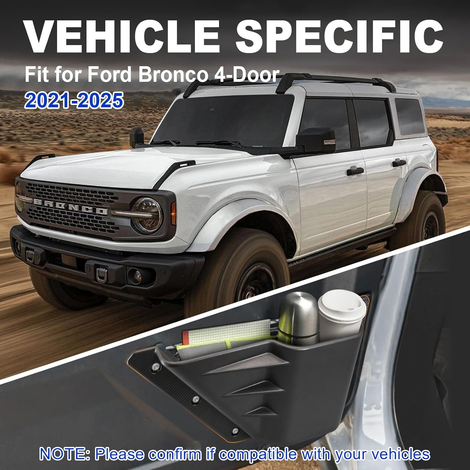 【VEHICLE SPECIFIC】NeaLia Ford Bronco door storage pockets, designed with precision 3D scanning to ensure a seamless fit for 2021-2025 Ford Bronco 4-Door(Not Sport); NOTE: To ensure compatibility, please verify your vehicle model before purchasing