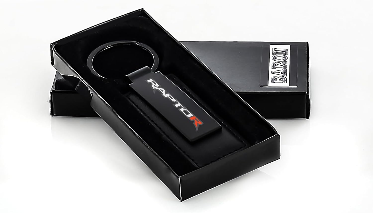 Ford Raptor Logo UV Cured Imprint on a black leather keychain