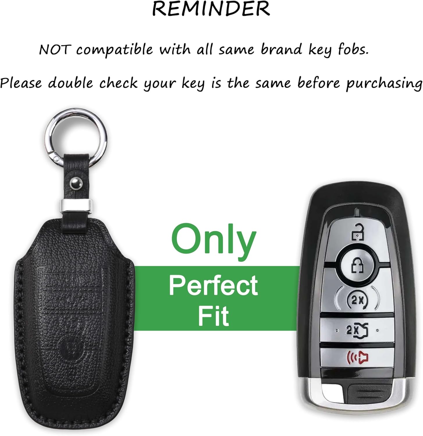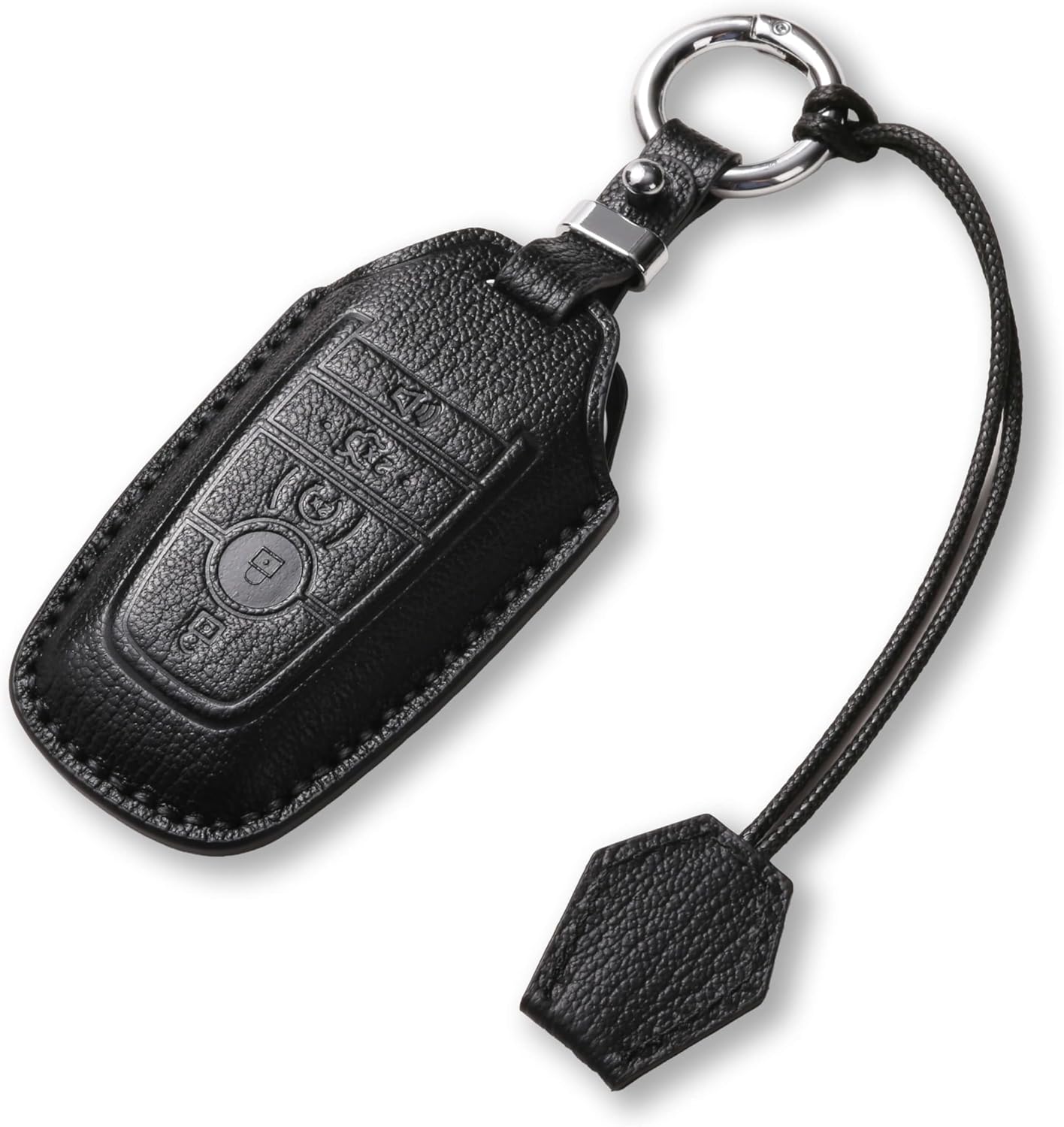 Genuine Leather Key Fob Cover Compatible with Ford Explorer Fusion Escape Edge Expedition F150 F250 F350 F450 F550 Maverick Mustang Lincoln, Key Case with Keychain & Lanyard (5 Buttons, Black)