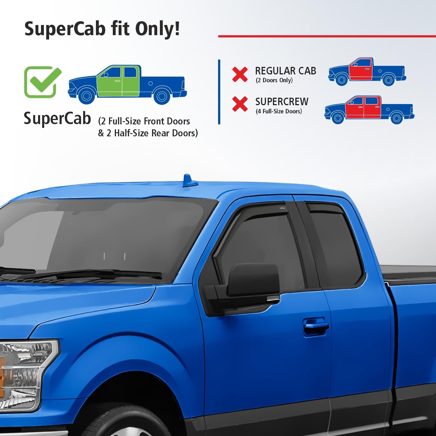 Attention! Vent deflector fits only for Ford F-150 2015-2020 SuperCab, Ford F-150 Raptor 2017-2020 SuperCab, Ford F-250 Super Duty 2017-2022 SuperCab, Ford F-350 Super Duty 2017-2022 SuperCab, Ford F-450 Super Duty 2017-2022 SuperCab, Ford F-550 Super Duty 2017-2022 SuperCab (does not fit for Ford F-150 2021-2025).
