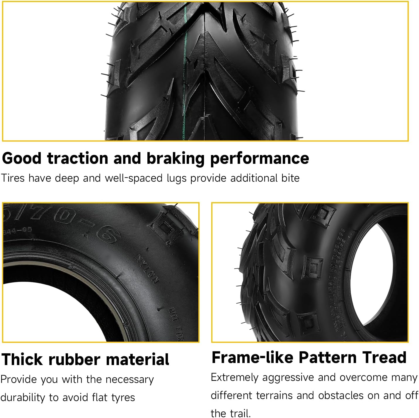 High Quality Rubber: This premium 145 70-6 tire is made of rubber, which is resistant to wear and tear. The thick rubber material will provide you with the necessary durability to avoid flat tyres