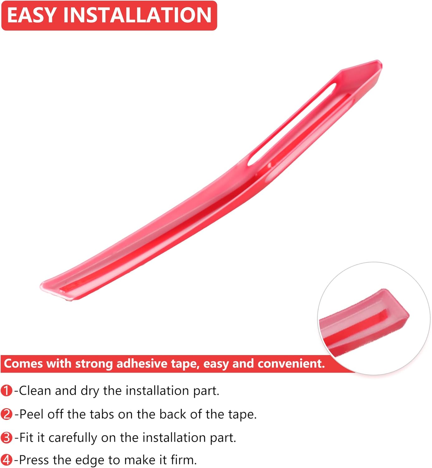 EASY TO INSTALL1-Clean and dry the installation part2-Peel off the tabs on the back of the tape3-Fit it carefully on the installation part4-Press the edge to make it firmNo cutting and no drilling are required.Warming the tape slightly before installation will help stick the cover trim better in place