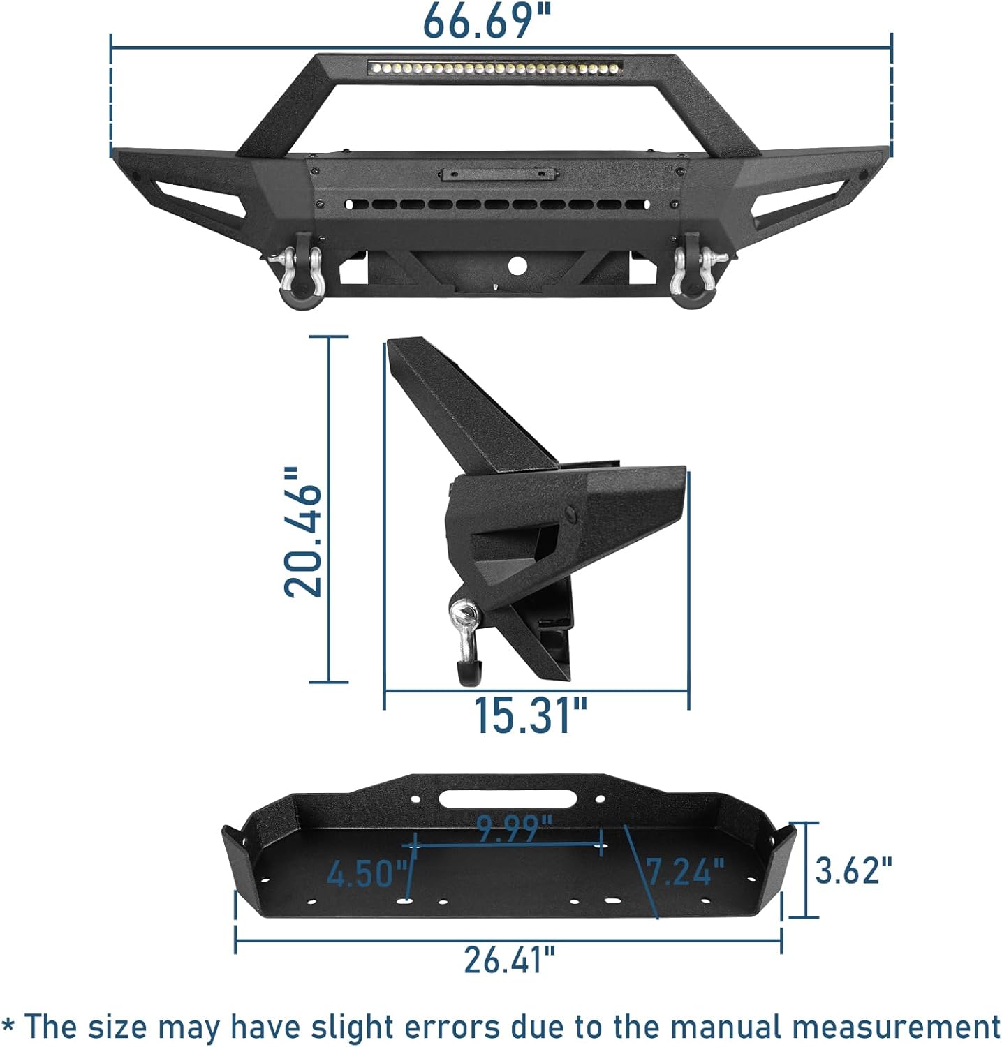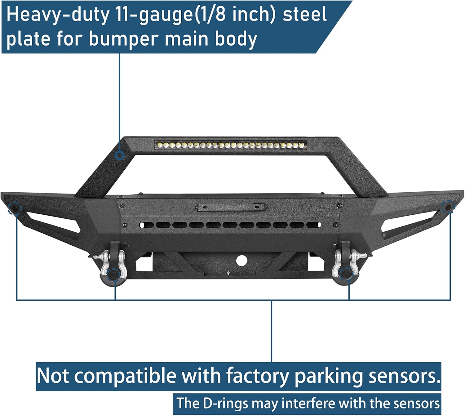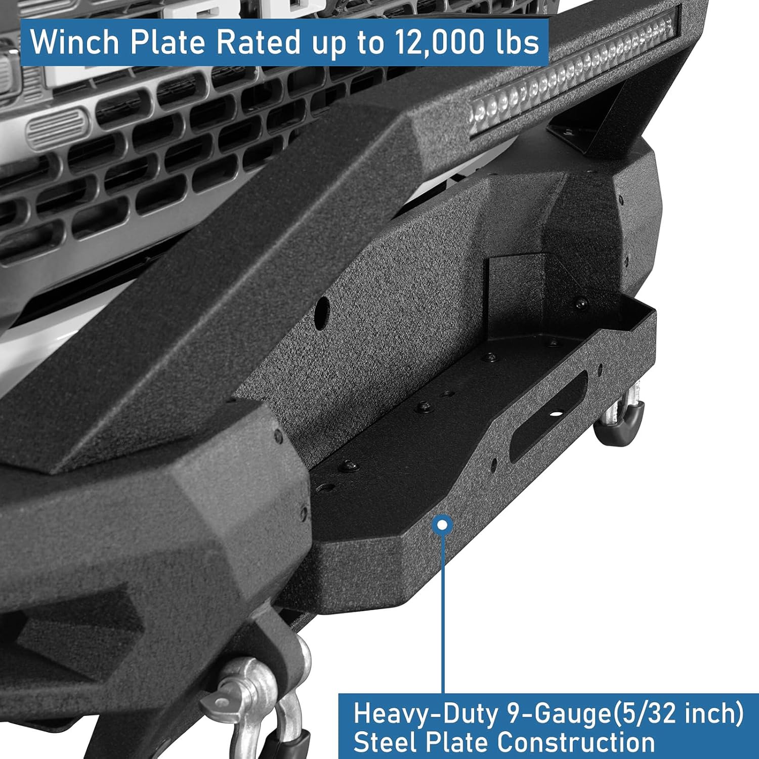 【Heavy-Duty Construction】- Heavy-duty, high tensile 11-gauge (1/8 inch) plate for the bumper main body. Front bumper weighs about 110 lbs