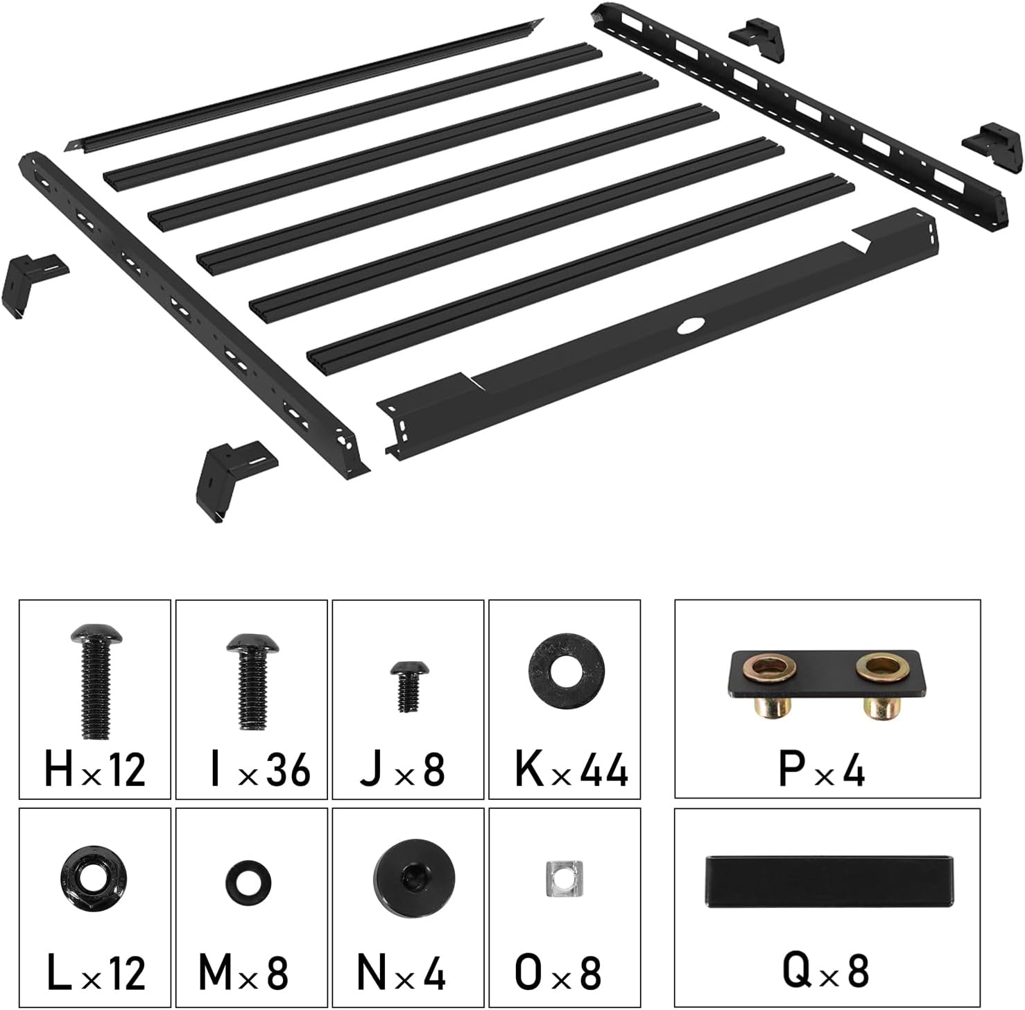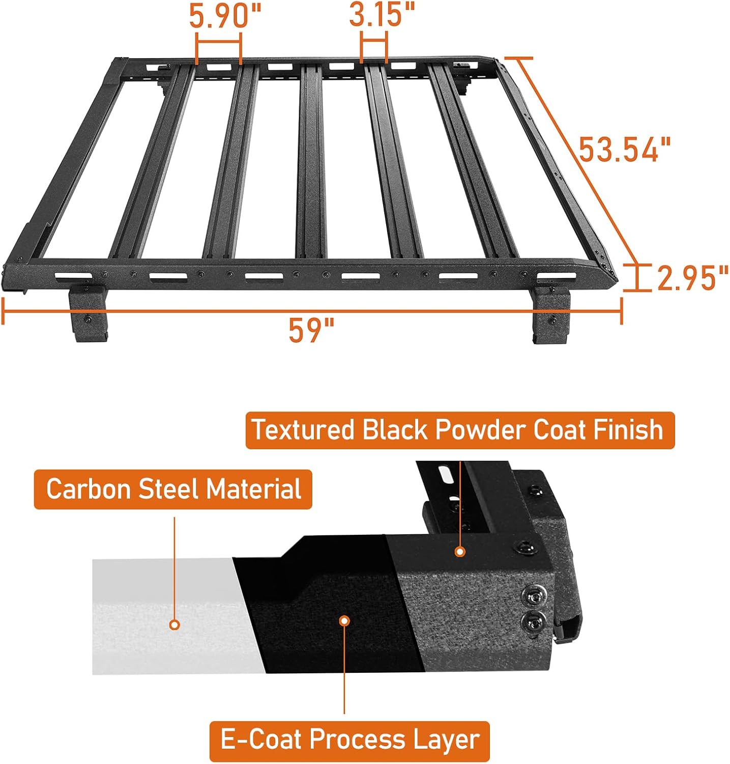 【Aluminum Crossbars】- Includes five 3.2″ x 0.8″ extruded aluminum crossbars with a durable textured black powder-coated finish. Roof rack measures 53.5″ wide, 59.0″ long and adds 4.3″ to vehicle height. Total weight: 61 lbs