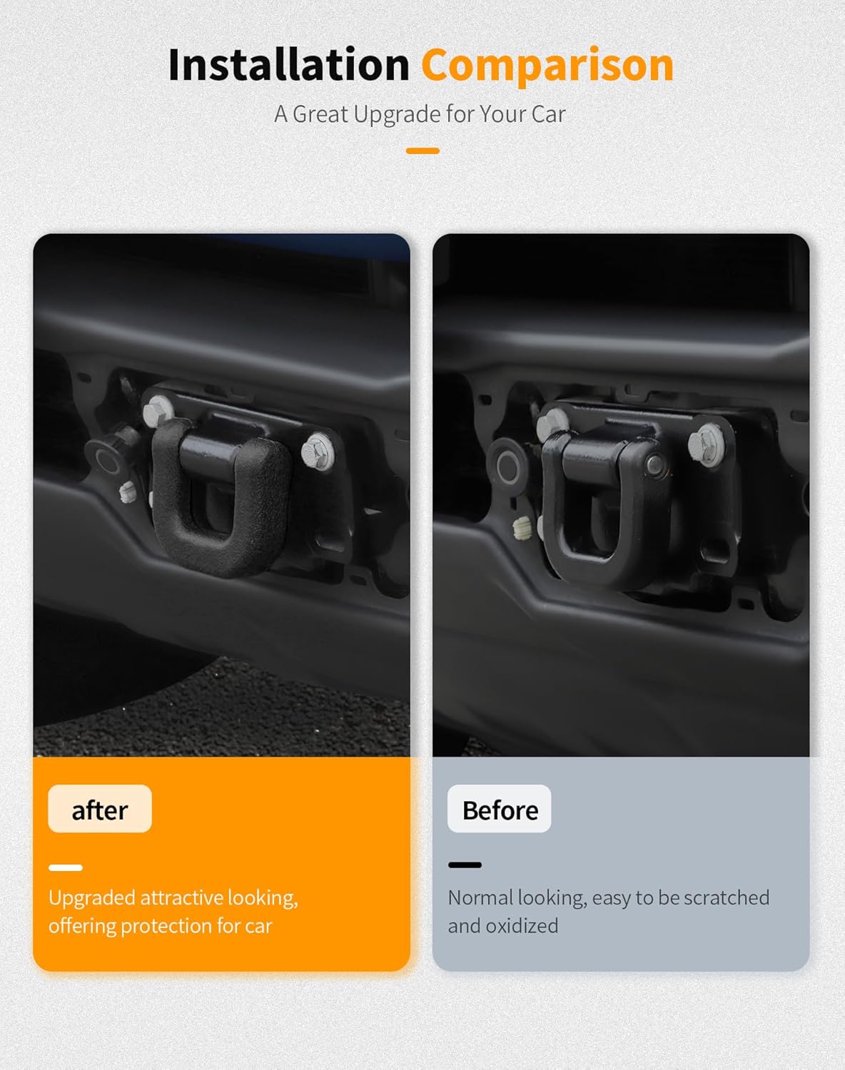 FUNCTION– This tow hook sleeves for Ford Bronco could effectively protect the tow hooks from dirt, debris. Additionally, they should be designed to be easily removable when the tow hooks are needed for recovery purposes.