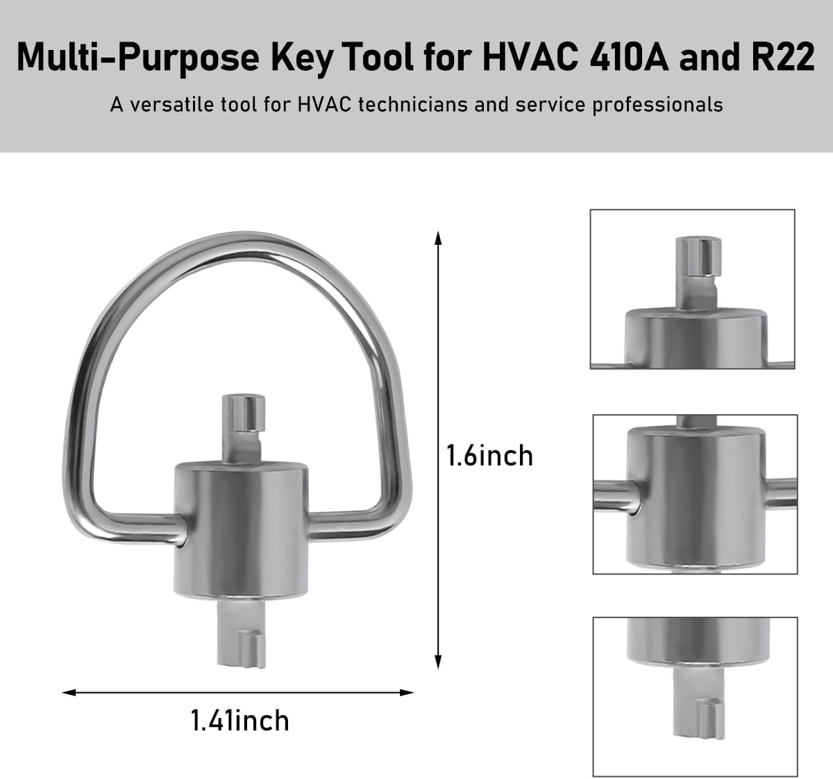 【Compatibility Scope】: This HVAC multi-purpose key tool is compatible with 410A and R22 refrigerant locking caps. It can be used in most HVAC systems that utilize 410A and R22 refrigerants, such as home air conditioners or other refrigeration equipment.