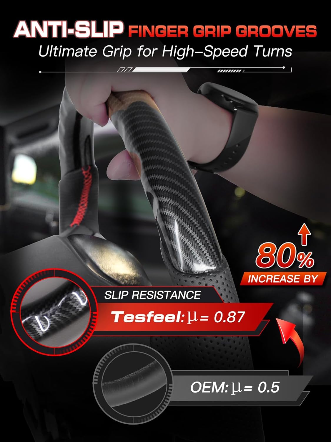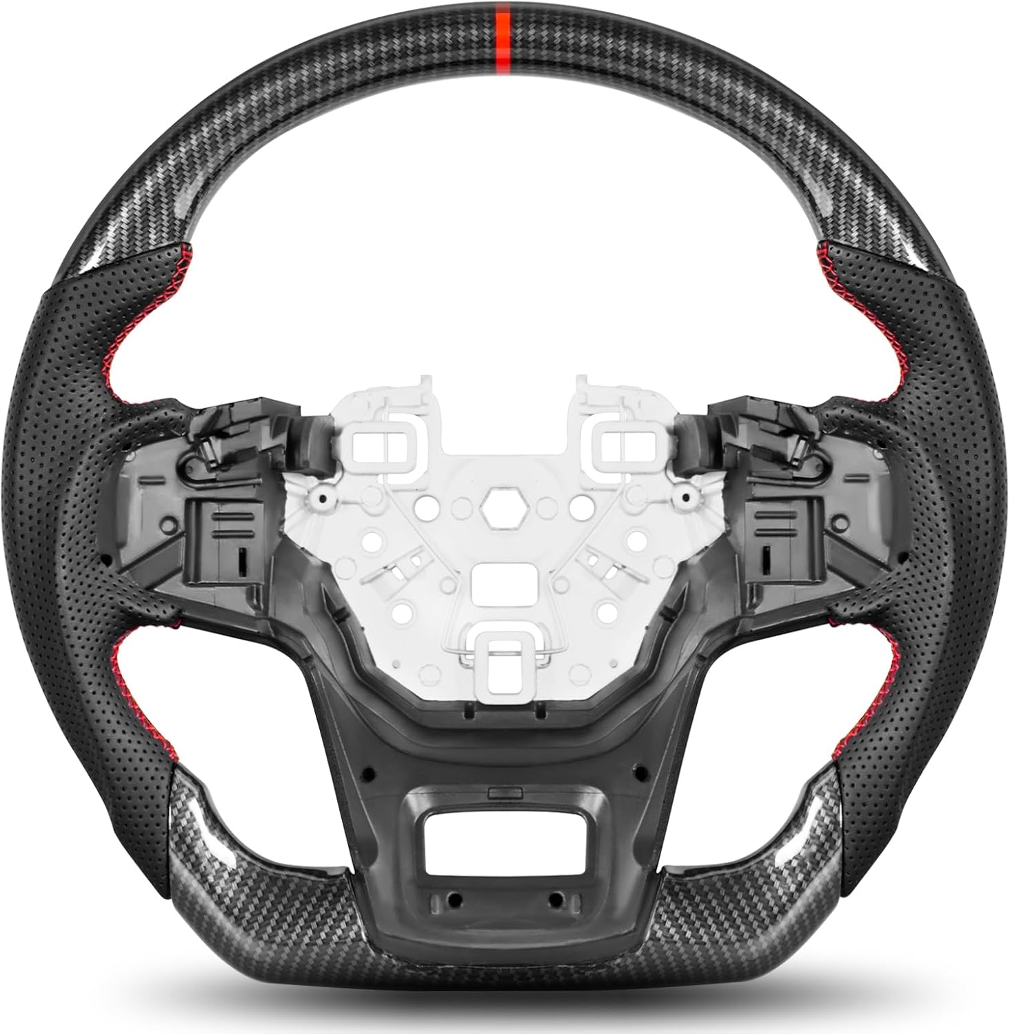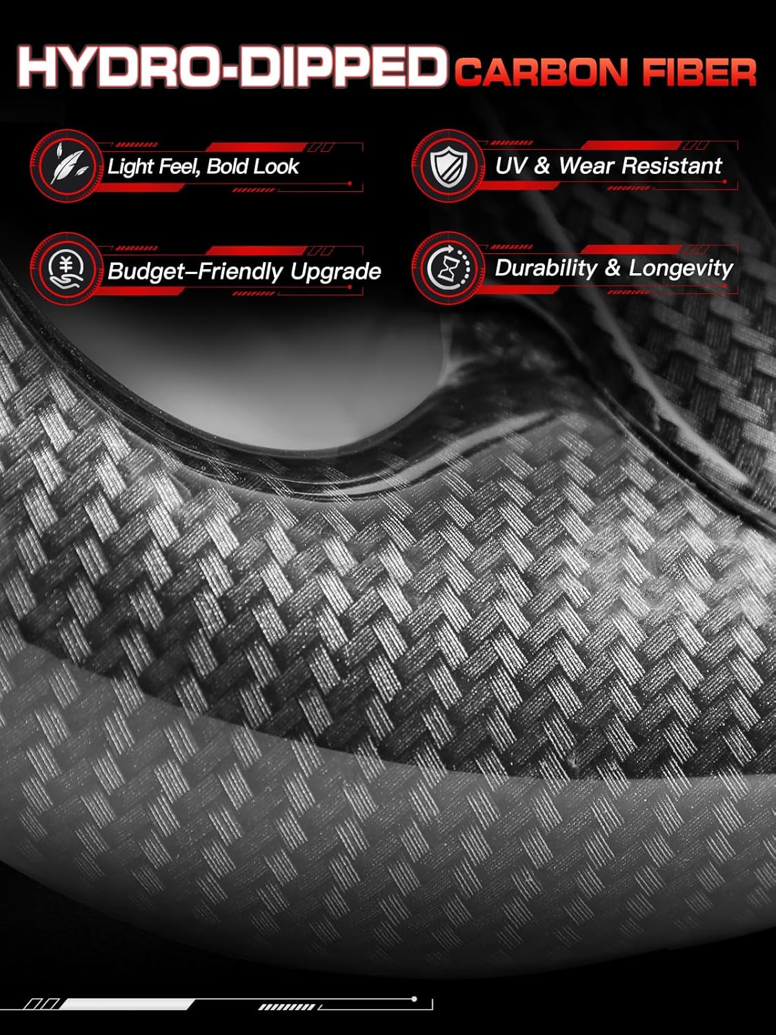 【Premium Materials】 Crafted from high-quality hydro-dipped carbon fiber, the wheel features a striking woven pattern with a glossy finish that adds an aggressive, off-road-ready style. The hand-stitched perforated Nappa leather grips deliver superior comfort and anti-slip performance for confident control on or off the trail.