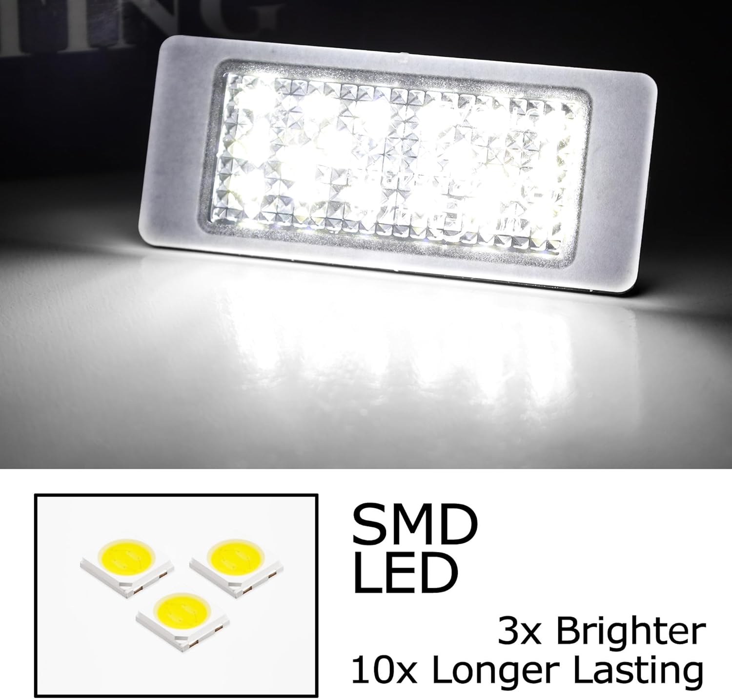 Direct fit replacement full LED license plate light assembly featuring super bright xenon white LED diodes with built-in CAN-bus error free decoder, ensuring no bulb out warning post-upgrade