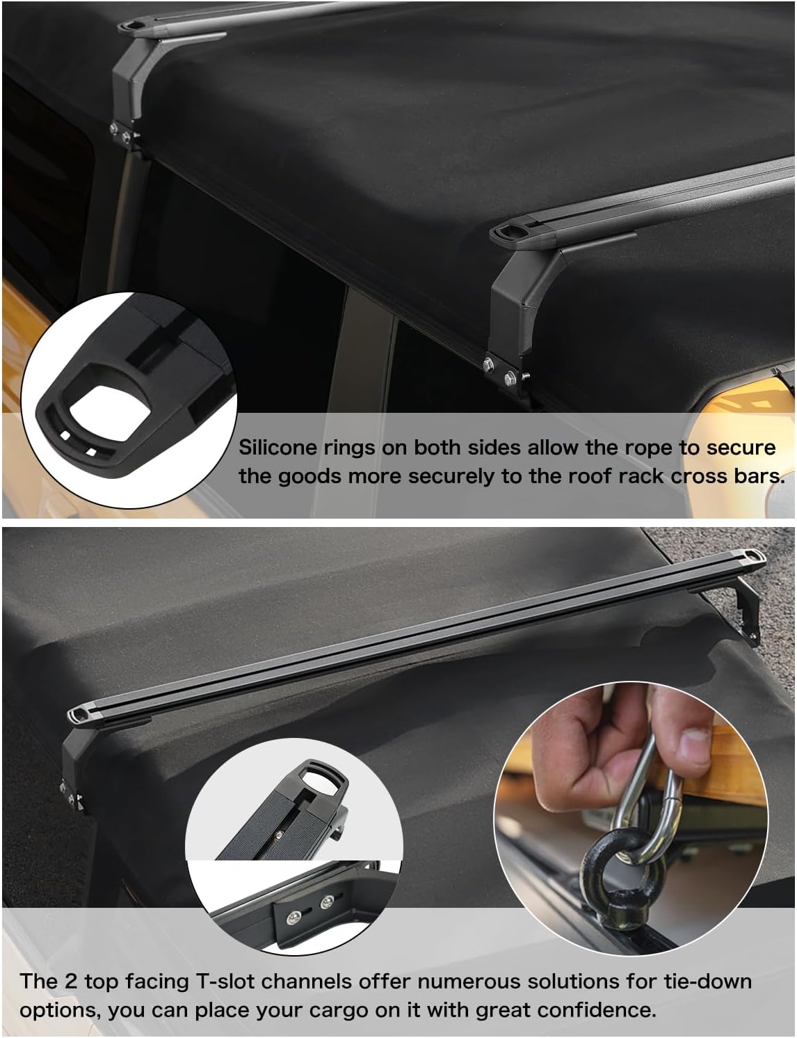 【Multiple tie-down options】Silicone rings on both sides allow the rope to secure the goods more securely to the roof rack cross bars.The 2 top facing T-slot channels offer numerous solutions for tie-down options, you can place your cargo on it with great confidence.