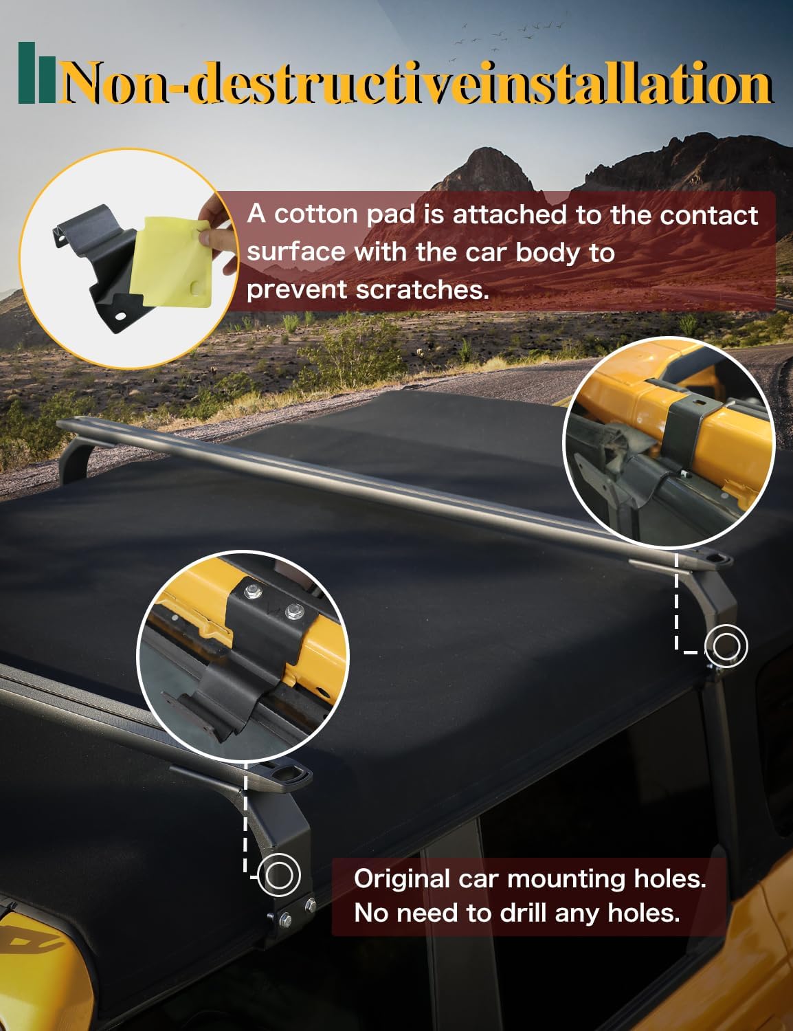 【Non-destructive installation】Installation in the original car holes, no drilling required. The brackets that contact the bronco body are covered with cotton pads to avoid scratching the car body. The roof rack includes cross bars, mounting brackets, and hardware, and can be easily DIY installed in about 30 minutes according to the installation instructions and installation video.