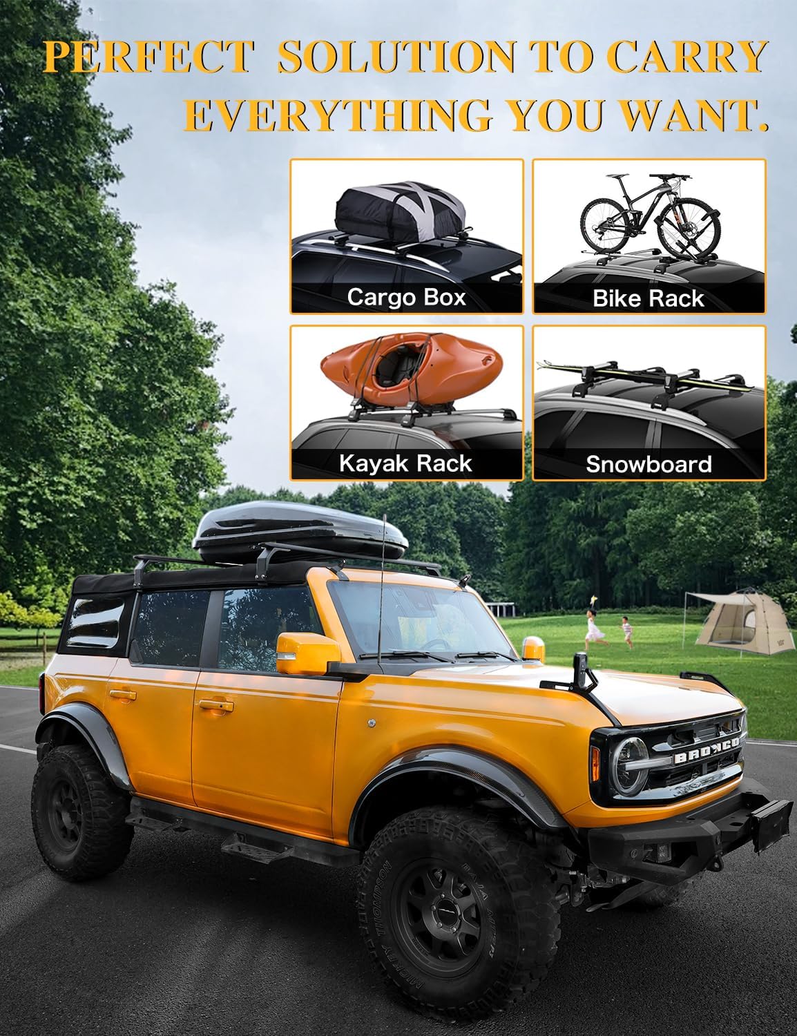 【Compatible with Ford Bronco Soft Top 4-Door】Our soft top roof rack cross bars are specifically designed to fit perfectly on the 2021.2022.2023.2024 Ford Bronco Soft Top 4-Door. Please ensure compatibility before making a purchase. (Note:NOT compatible with for Bronco Hard Top and Bronco Sport)