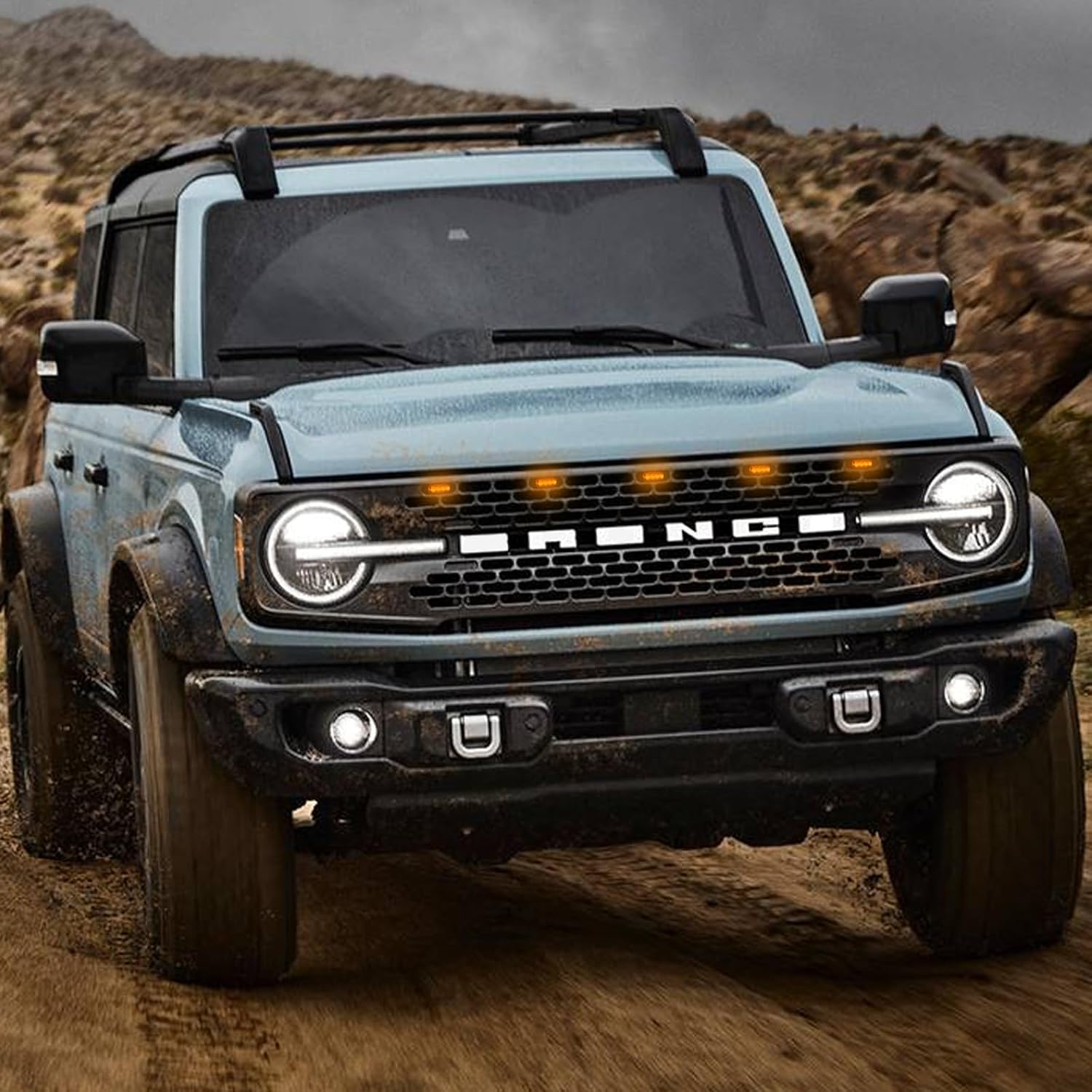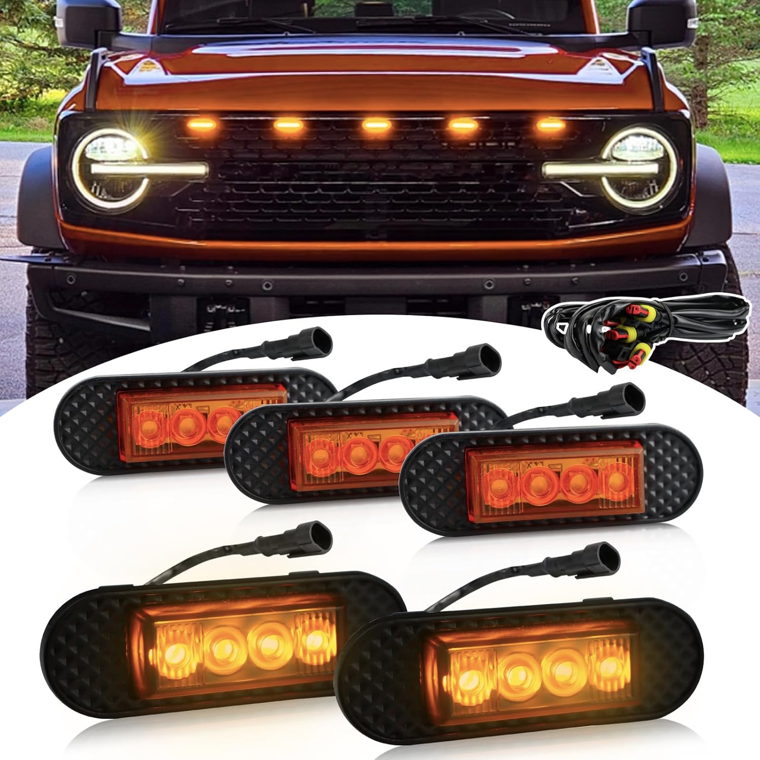 LED 5pcs Front Grille Light Compatible with 2021 2022 2023 Ford Bronco Badlands Wildtrak Everglades Upgrade Grill Lamp Accessories (Amber)