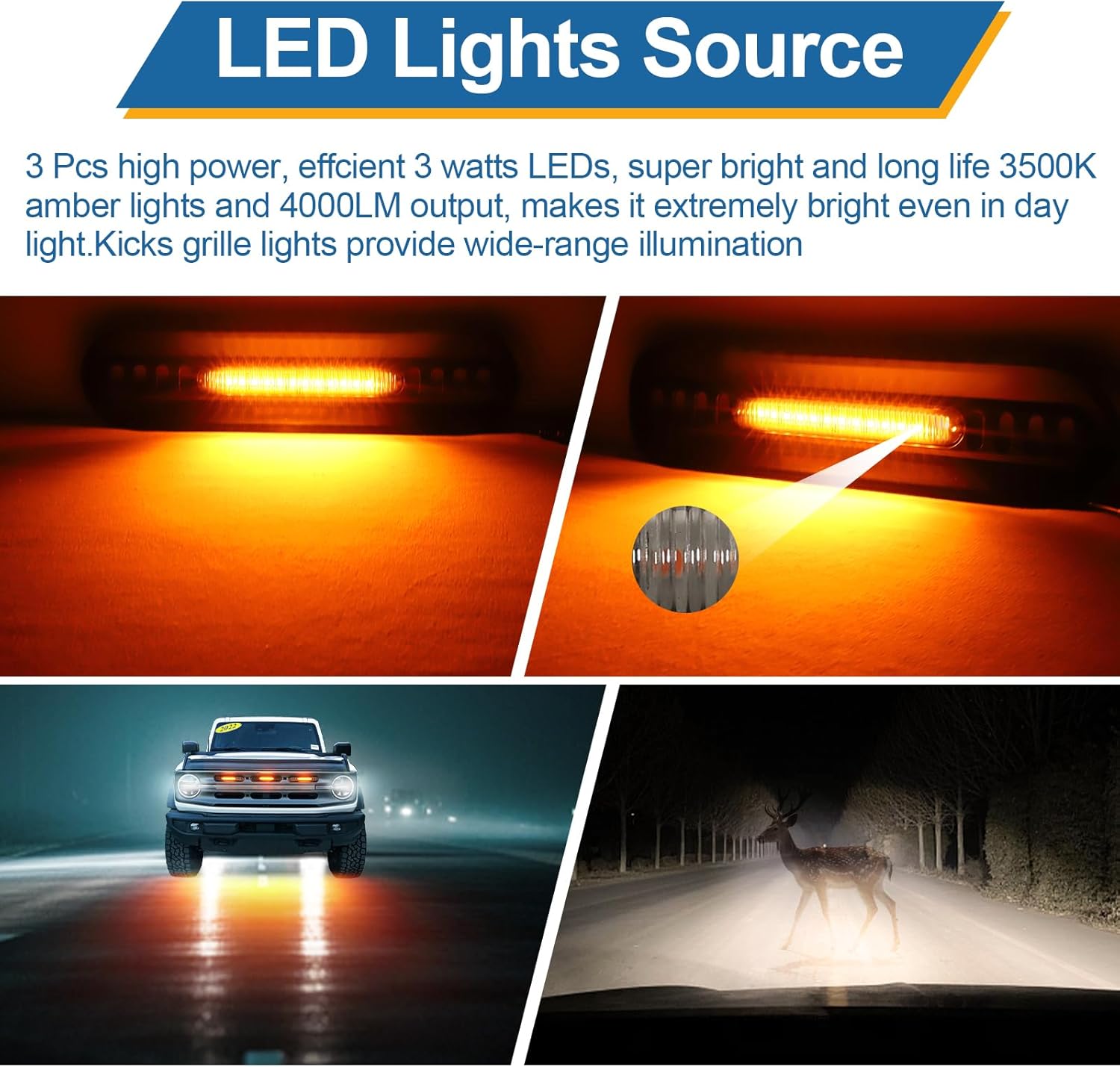 LED Grille Lights for 2024 Ford Bronco Accessories 2021 2022 2023 Front Grill Insert Light Black Snap on Lamps Fit for Big Bend Outer Bank 2/4 Door (Amber Lights, 3PCS)