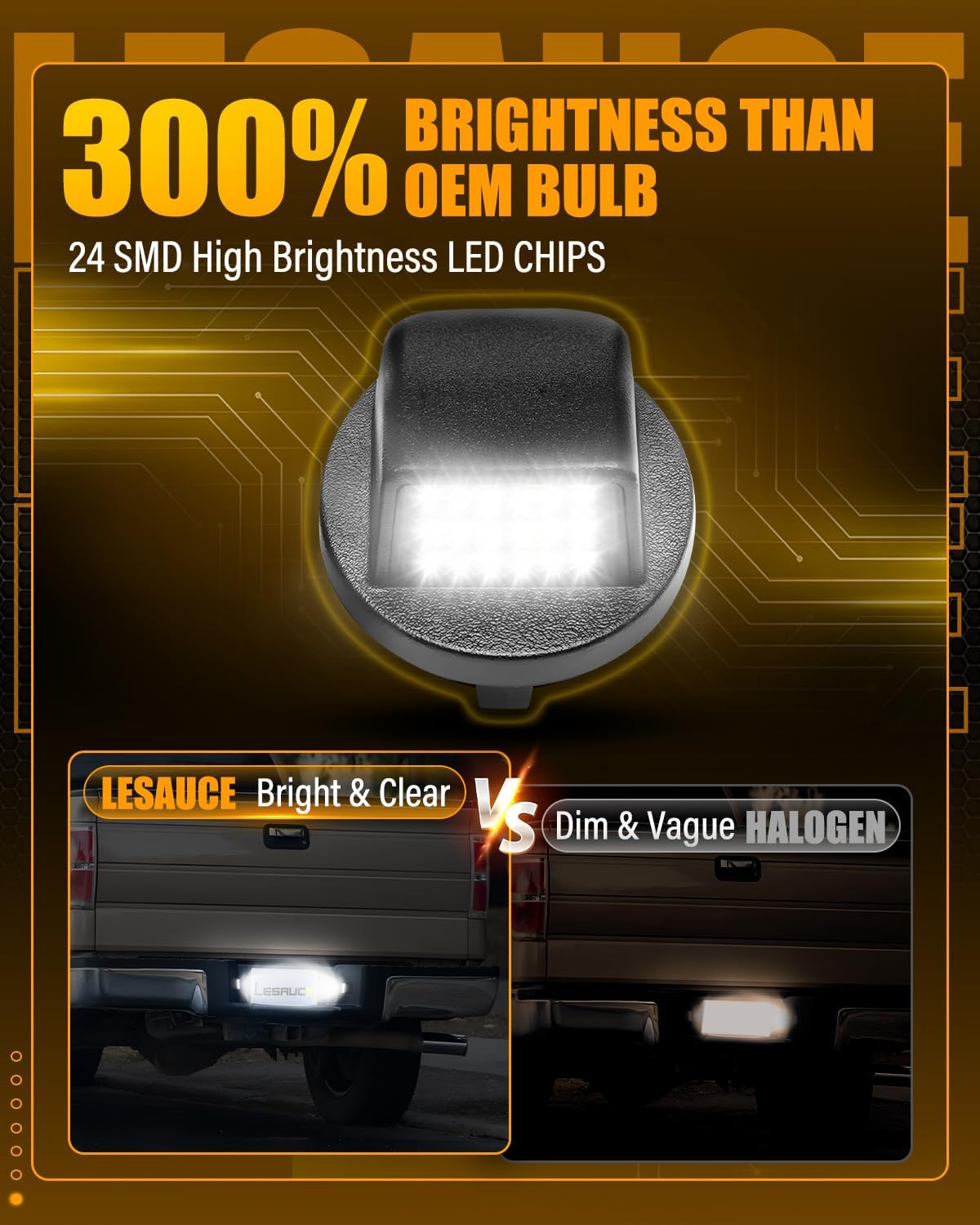 【24PCS LED, 300% Brightness Improved】Each LESAUCE LED license plate bulb for f150 is equipped with 24 SMD LED chips, providing 6500k pure white and 300% Brightness than OEM bulbs, ensuring excellent visibility in low light conditions, especially at night