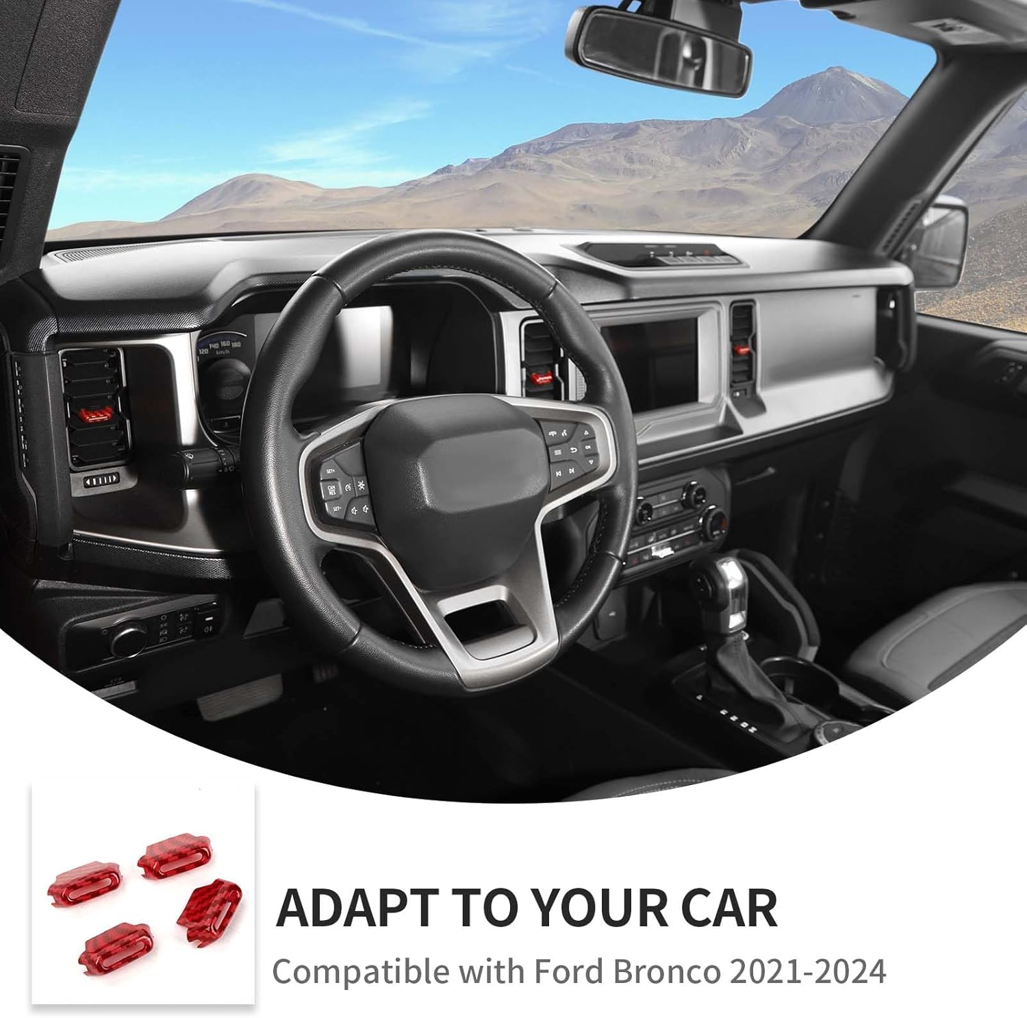🚘Usage: Red Carbon, Fit for 2021-2025 Ford Bronco, Dash Vent Insert Covers, Dashboard Air Vent Knob Trim Kit, ABS.