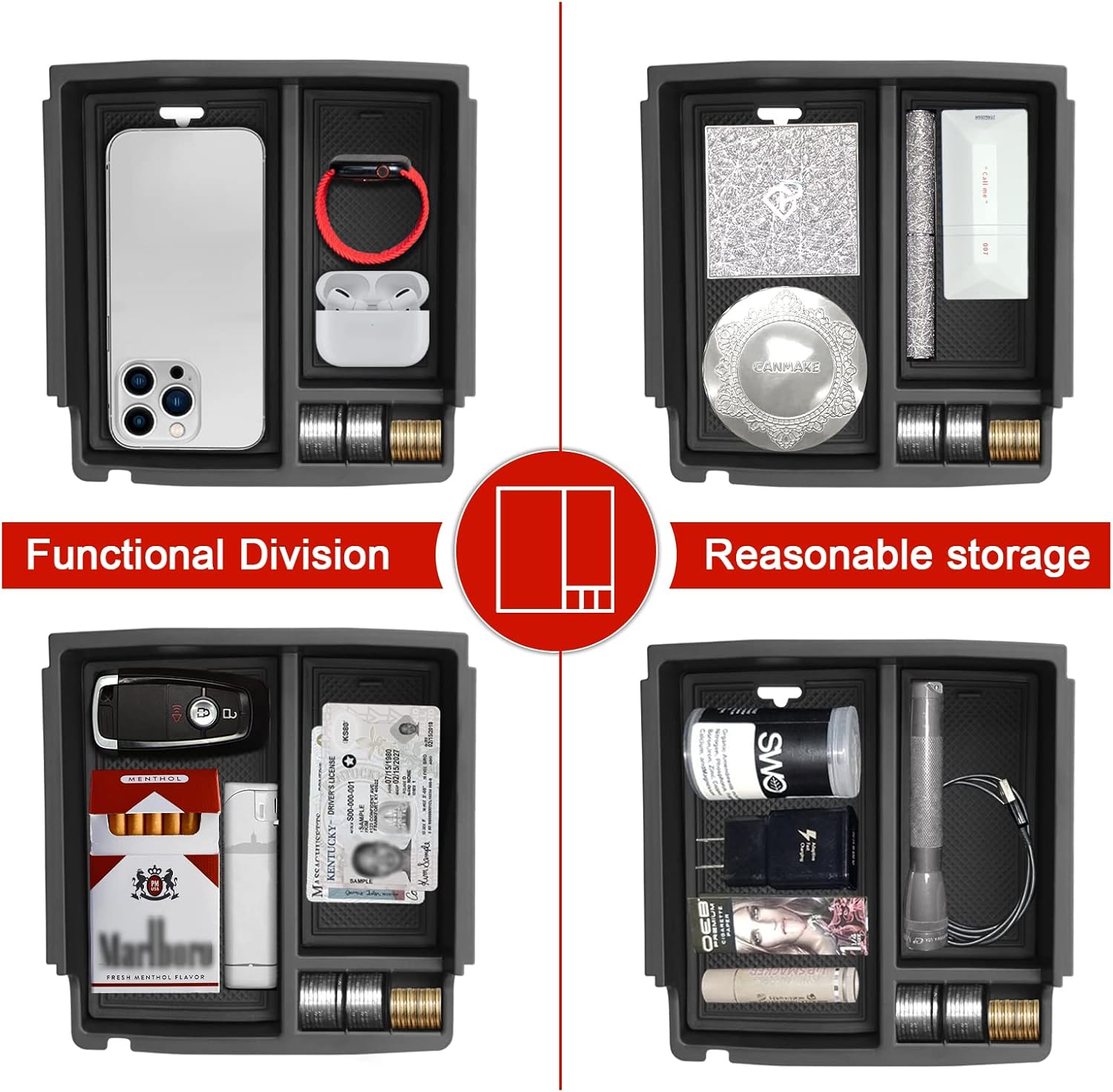 Function: If you often cannot find the small items in the car, you must need this organizer. provide space to put your key, cell phone, charging adapters, credit card, ID Badges, and coins, etc