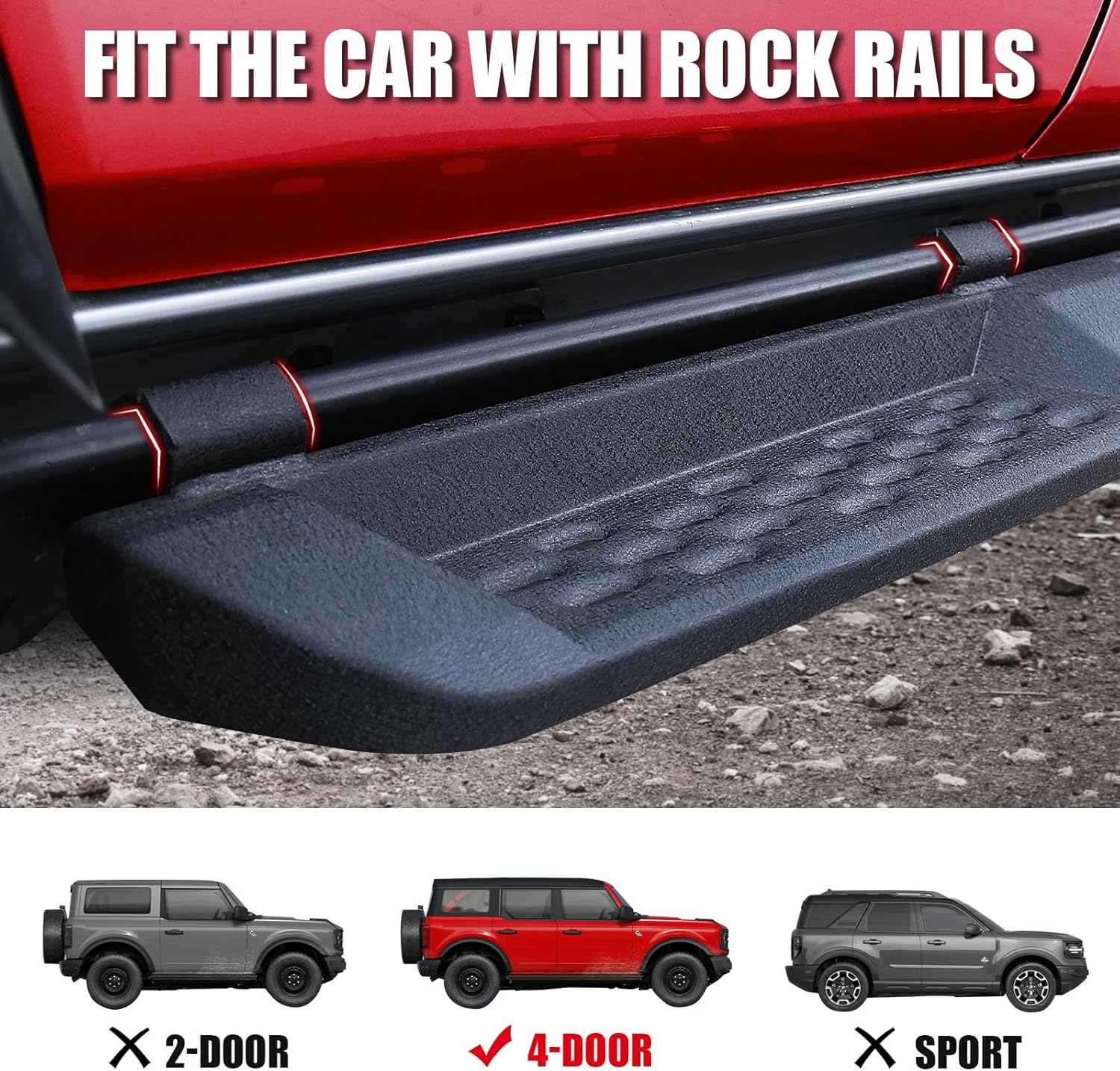 Fitment: The running board fits Ford Bronco 2021 2022 2023 2024 4-door with rock rail. (Not fit 2-door models, Bronco without rock rail, or Bronco sport)